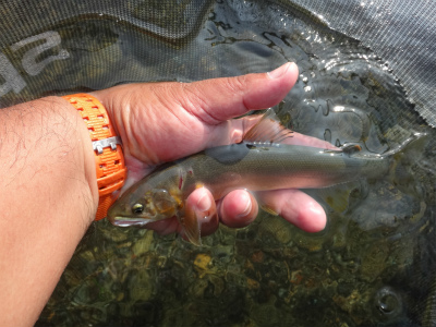 初めての場所なので右岸を少し上がってみます。岩盤にも鮎は付いていました。石がやや小さく揃った瀬は白っぽく見えますが、ヘチや大きな石には垢が付いています。ただ、水量が多いので右岸からは攻められる場所が限られています。大きな石裏で白い鮎が2匹、流れの強い大きな石組の中で強烈な当たりで23pが1匹、それを入れたら即当たりでしたがバレ。感触としては鮎は多いが攻める場所が限られていて粘るのには不向きか。流芯には良い鮎が居るようですが、リスクが高い。その下はどうか。岩盤帯が終わって開くところは良い感じに見えましたが釣り人が居たので調査できず。さらにその下流は一旦小砂利になるものの、その下にまた良い瀬が続いています。真ん中に岩盤が出ている辺りからが良さそう。ここでは白っぽい鮎も黄色い鮎も掛かりました。鮎の補給を期待できそう。ほかの方も掛けていたので戦闘ポイントとしてチェックです。人が多ければ岩へ渡れば右岸、左岸と広くできそうです。