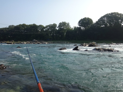 | 右上の鮎が掛かったポイント。同じところで何匹も出ない感じ。向こうの流れに走られると着いていけません。 |