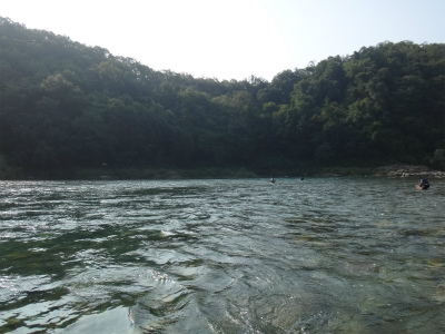 ここから下流は良い感じの平瀬です。水深も押しもあります。川の中ほどにあるあの岩付近からやれば面白そう。でも泳いで行かないとたどり着けない感じ。流されると下流は大淵で渦巻いてるので危険。 |