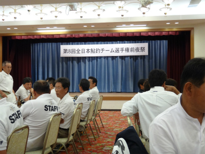 さて夕方はこれもこの大会の大きな楽しみの一つ、前夜祭です。有名選手に鮎関係メーカーの大御所の方々、こんな席に居させてもらえるだけで感激ですね!さて下見の疲れもあって部屋に戻るとすぐにスイッチオフです。良く眠れましたが、なぜか岡田名人、森川名人とも寝不足や〜と怒っていました。何があったのでしょうか。私には分かりません。(笑)