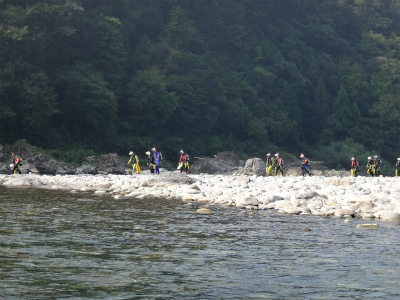 消防の方たちが水難救助訓練をされていました。川の様子を覚えるのでしょうね。出動の時は濁っている場合も多いでしょうから。カッコいいですね!お疲れ様です! |