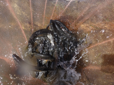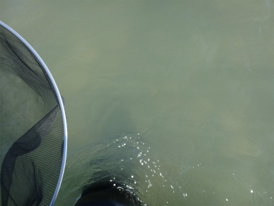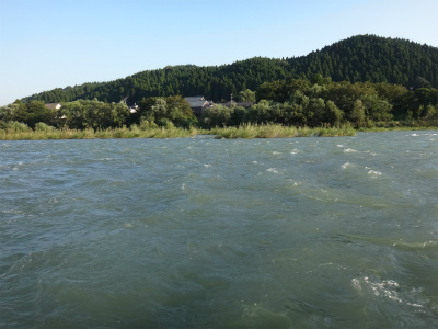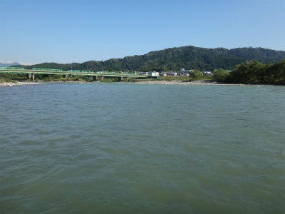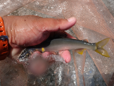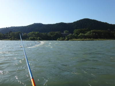 8月20日に来て以来の九頭竜川は、台風18号による増水でまだ30pほど水位は高く濁りも残っていました。まだ入ったことのない鳴鹿大堰上流エリアに入りたかったのですが、この水位と濁りでは知らない場所は危険です。なので以前入ったことがある大会本部前の五松橋下流に15時から入りました。石色は分かりませんが、ヘチも真っ白で手で触っても垢は感じられません。これは厳しそう。案の定1時間やって反応なし。ヘチでは小型の鮎は沢山確認できました。少し上はどうか。大堰下流へ移動します。ここは専用区ではないので威縄漁の杭が瀬肩を大きくカバーするように打たれていました。入ってみるとここは少し垢が残っている感触です。コロガシの人たちが居たので、その方たちが探っているもう一歩前へ出て、まだ触られていないだろうポイントを流してみます。すると気持ち良い当たりで黄色い鮎が掛かりホッとしました。1時間ほどで10匹掛かり、垢が残っている場所では掛かることが確認できました。サイズは16〜20pでサビも出ずきれいな鮎ばかり。この辺りはほとんど垢が残っているようです。五松橋下流とすごく違います。上流もこんな感じなのか。