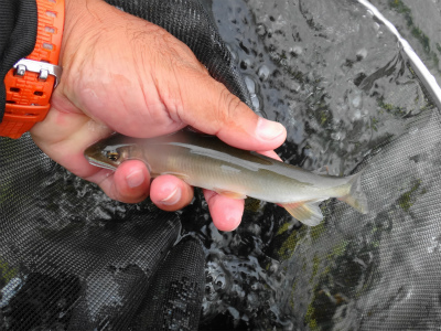 | この休みに鮎納竿釣行をしようと考えていました。できれば北山川で。しかし北山川、熊野川はいまだ濁りが強くダメらしい。行ったことのない日高川や日置川は良い情報が聞こえてきます。今シーズンは初めての有田川でスタートしたので、最後も和歌山初めて河川で終わるのも良いかな、と考えました。でも残念ながら台風接近と日曜の雨で釣行できるかどうかも不安な状況に。諦めてアオリ狙いにするつもりでした。でも海もうねりが出て来たらしい。海も諦め何しよう?ん?長良川中央は水位も下がってきて出来そうです。雨もなんとか1日持つかな。一人では寂しいので榎本さんを誘い出して行ってみます。 行ったのは晩期の定番岐関大橋下流です。喫茶ほくとさんはおとり終了、矢島さんは11月3日まで置いてあるそうです。誰もいない岐関大橋下流では鵜が一生懸命潜っていました。と言うことは鮎は居ます。曇り空で寒い。水位も前回より30pほど高い。 榎本さんを待ちきれず川へ。まだ7時過ぎです。瀬落ちの開きが良さそうに見えました。鮎も多く跳ねています。でもここはいつも裏切られるポイント。水は多いけど先回掛かったポイントへ。流れが速い。おとりは4匹も居ます。ブッこんでみましょう。1匹目、流されてサーフィン状態。仕掛けはノーマルです。鼻管もおもりも無し。2匹目、手前から底へ入れて送り出すと踏ん張ってくれる。ひたすら待つ。待つ。待つ。グリングリン!掛かった!16pほどのぷっくらしたメスです。替えて送り出す。全然落ち着かん。流されるまま落ち着くところを探して30mほど下ってやっと掛かる。次は速攻で掛かる!それより下流はガリ師の方がいたので戻る。もう一度養殖おとりで。おとりが良く動くところには野鮎が居るようです。そんな時はそこに留まるように我慢すると掛かってくれました。良いオスが掛かって強い流れにグングン入って行くと素直にギュン!と掛かる。これですゎ!パターンが掴めた。すっと送り出す。ゴン!嫌な感触。ビヨーン、ビヨーンは切れたガリ仕掛けっぽい。ここのポイントはこれが唯一ダメなところ。水深も胸近くあって仕方なく切る。もう一度仕切り直し。送り出すと一発でシュパーン!良いメス!これは掛かるパターンか?スッと送り出すとスッと居なくなる。ありゃ?仕掛けが高切れしていました。まだ放流の儀はするつもりでなかったのに。良い鮎を2匹もロスしてしまいました。その周辺は掛かりましたがやや下がると浅くなり反応薄い。その下の瀬肩まで来ると反応が出る。ここは流れも強く当たりが良い。11時まで11匹。思っていたより釣れました。あの2匹をうまく回せたら。。。が残念でしたが。 今日はお昼もゆっくりと。朝ここへ到着して一番に研いでおいたお米でマツタケご飯を炊きます。まずは永谷園のまつたけお吸い物を1袋、黙って食えば分からないマツタケ風に切ったエリンギを2本、きのこご飯の元を1袋、これで十分マツタケご飯です。立ち寄ったクラブのN村さん、O原さんも加わってランチを2時間、こんな楽しみも来春までお預けです。 さていよいよ最後の竿だし。この頃には雨が落ちてきました。開始直後に良い当たり!でもバレる。午後は良くケラレました。7回掛かって3匹取り込む。あとの4回は逆針切れてからのバレでした。チラシが無くなって刻でやっていましたが、ストレート系の針が良かったと思います。でも最後の2匹は瀬でしっかりと掛かりました。あまりの寒さに3時でギブアップ。すべて放流して儀式終了! 午後からはわざわざ京都から来られたという鮎4年目という方が一人増えて友釣り師は3人でした。鮎はまだ多く居ます。この台風であまり増水がしなければ来週も釣れると思います。タイツでは寒いですが。 今回もまずは3本チラシを使用しました。とてもいい感じで掛かったのですが2本で在庫切れ。しわりタイプの2本ヤナギに変えたらケラレばかり。その後刻4本錨にしましたがこれもバレました。イニシアを使えばよかったとあとで後悔です。 結局長良川は今シーズン15回も入りました。根尾川がダメで最近はすっかり長良川がホームとなっています。今シーズンもしっかり楽しませてもらった長良川に感謝して2013鮎シーズン終了!冷え切った体を武芸川温泉で温めて帰りました。 |