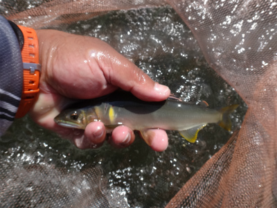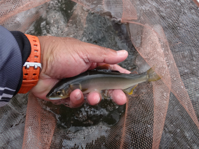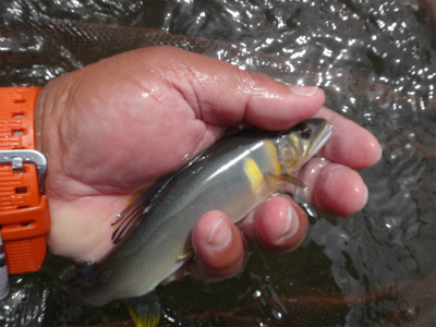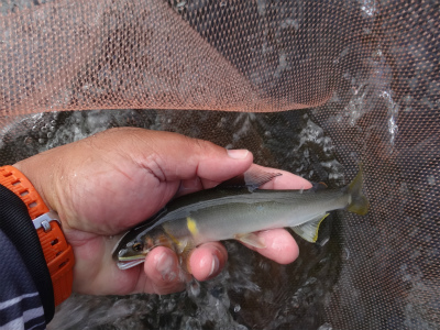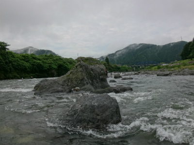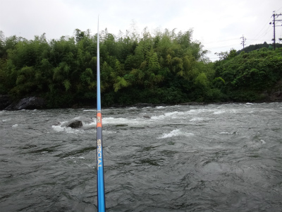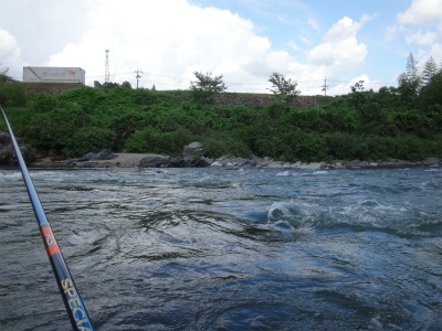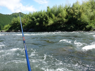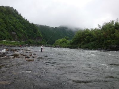 | 板取から長いトンネルを通って郡上へ。いつもなら長良川を上って行きますが今回は下流へ。初めての美並エリア、粥川出合いでやってみることに。広い駐車スペースが道路の一段下にありアプローチはとてもいいところ。ラフティングの発着場?なのかな。下ってくる道中にはすでに沢山の鮎師がいましたが、ここは無人!子宝の湯に浸かってから夜宴です。鮎釣りで良く動くのに、飲み食いも増えて痩せる暇なし。前日は2時間ほどしか寝ておらず、睡魔に襲われて10時ころにはダウン。寝付いたころに激しい雨!それも苦にならず爆睡して3時半に起こされました。 多少は釣り人の気配がありますが、郡上や大和エリアのような熱気は皆無。夜半の雨で20pほど増水し、濁りも少し出ていました。釣りには影響ない濁りですが、初めてのポイントで石が見えないのはつらい。岩盤も多く、深さも掴みにくい。瀬の中盤にあるヨレから開始してみます。鮎が跳ねるので間違いなく居ます。流れに入れて待っても掛からないので根掛かりが怖いですがフリーにして泳がせました。するとおとりと同じくらいの鮎が掛かった!でも色白です。それを流れに入れる→掛からない→タルミでフリー→色白掛かる→流れに、で追いを待ちます。 上手の釣り人を見ると流れの中のちょっとしたブレーキエリアで待ちながら掛けています。なるほど。波を頼りに石の前を狙う。気が付けば水位も下がってきている。ドキューン!と長良の野生が掛かってくる。良く引くわぁ〜!何匹か掛かるが、目の前の流れは速く深く押しも強そうで前には出られない。下にも下がれない。狭いエリアで我慢して釣っていましたが、8時起床の重役出勤で出てきた和人君が下で良型を入れ掛かる。我慢限界。その下に入り込んで鮎をさらう。目印がスパーン!と消し込まれるキッツイ当たりを楽しめました。20pまででしたが、丸々としていてコンディションの良い鮎です。昼までに21匹でした。 皆でツ抜けできるやろか?と話していたので上出来です。なが−い昼宴のあとは粥川出合いより上から開始。フラットな平瀬で川底が分かりませんが、流れ的には良い感じです。でも反応出ない。色々な筋を探って行きます。そのころ上流の空には入道雲と真っ黒な雲。そして雷鳴です。上流部で降っているかも。川下からの風が川上からに変わってきたのでたぶん雨は近い。掛かる筋をピッチを上げて探る。掛かった筋ではパタパタっと掛かりました。いよいよ暗くなってきて皆川から上がってしまいました。往生際悪く粘る。ついに土砂降り!ずぶぬれで止める。なんとか10匹釣りたかったのですが9匹で終わる。合計30匹は予想以上でした。なにより鮎が綺麗で水量がある瀬で掛かるのがイイ!十分楽しめました。 このポイントですが専用区です。しかしラフティングが盛んな場所なので敬遠する方が多いようです。解禁日だけは休みだそうですが。周りで一番釣っている方は50匹程度だと思います。かなり腕達者な方でしたが。感触としては付鮎は取ってしまうと次がいません。でも流れが太く石も大きいのでたくさん残っているとは思います。左岸寄りに流芯がある場所で、和人君がそこに良いおとりを入れていましたが掛かりませんでした。瀬の中にある「瀬肩」と言うのか、ちょっとブレーキが掛かるような場所で良型が掛かるようでした。濁りが無い時にもう一度やってみたい場所です。 |