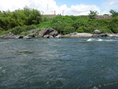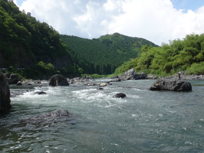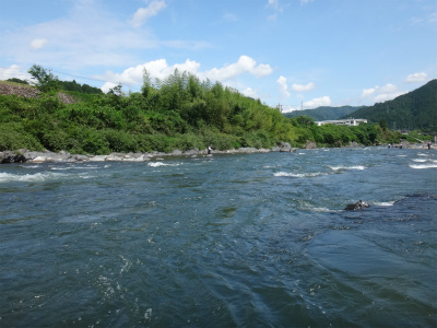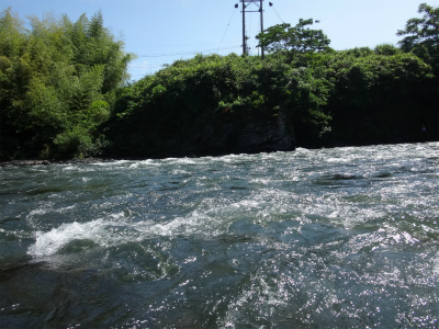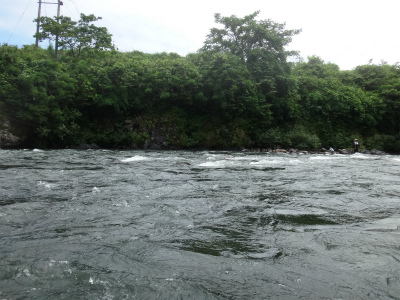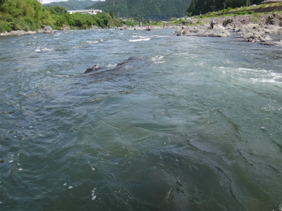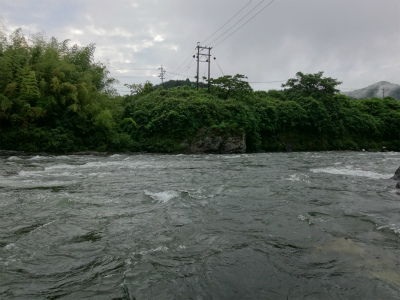 | ここから上はまた複雑な流れ。中州へ渡っている人もいましたが、増水すると帰れなくなりそうで怖そう。 | お昼頃でこんな濁りです。深さが分かりにくいので難儀します。 |