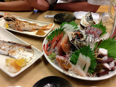 | 夕方納竿前に朝のポイントをやってみる。が掛からず。 | 翌日の夜は富山の友達ときときと魚で一杯。高岡の海蔵(いくら)ちゃんという居酒屋さんでしたが、安くて新鮮!大満足でした。この刺身盛りが2人前で2,000円、のどぐろ塩焼き1,000円、かなり飲みましたが一人4,000円でおつりでした。 |