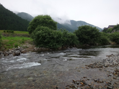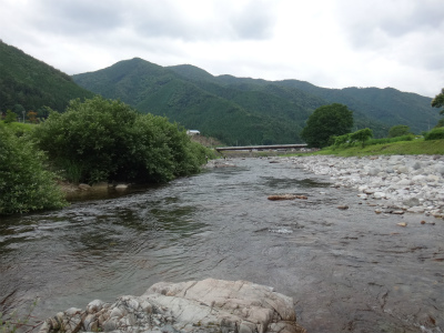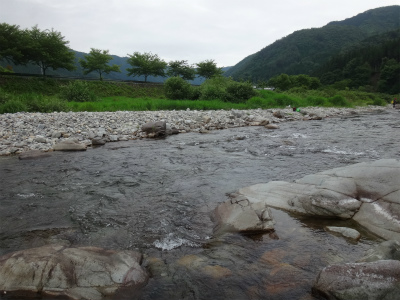 | マスターズブロックへ行けることになったので、斉藤師匠と馬瀬川解禁へ行ってみようということになり、金曜夜から走ります。鈴鹿から180q、東名阪長島ICから下道で3時間半で馬瀬に到着。マスターズブロック大会本部直ぐ近くの民宿神垣内(かみがいつ)さんは解禁前日はオールナイトでやっているとのことでおじゃましました。今年5枚目(長良郡上、中央、宮川上流。九頭竜)の年券を購入!6月は年券貧乏です。また、神垣内さんはおとりが3匹1,000円でお値打ちです。郡上などと比べると前泊組は少ないようです。中切のふれあい橋少し下流の道路わきに駐車し短時間の睡眠。明るくなる前から川へ降りていく釣り人が出てきたのであわてて準備し川へ。通称水泳場の小さい淵からの瀬付近に入りました。下流に斉藤師匠です。夜中に仕事を終え夜通し走ってきた椿さんはゆっくりスタート予定。馬瀬にしては気温も水温も低くない。早朝からでも掛かりそう。 4時半、期待して開始。手前から丁寧に。すごい気配!すぐに掛かりました。コンディションのいい黄色い鮎!これは良いかも。周りもボンボン掛かっています。人気河川の解禁は自分のエリアも限られます。限られたエリアで少しでも数多く釣ろうと考えるときはどうするのか。まず対岸に入られないようなポイントを選ぶこと。次に一番良いと思うところは後回しにして、人が来ないうちにその上下を探ってトビツキをまず掛ける。人が出てきたら一番ポイントを手前からじっくり攻めます。掛からないときは一番ポイントを早めに攻めますが、1匹目の鮎のコンディションや周りを見て掛かりそうならこれで少しは余分に数を稼げます。 さて馬瀬の解禁は自分も周りの方たちも9時ころまでは解禁モーニングサービスで楽しめました。しかし釣りきるとすっかり静かになりました。皆ウロウロしていました。自分もウロウロして11時までにちょうど50匹、斉藤さんは上下おじいさん攻撃に合いながら35匹、椿さんは水泳場上の瀬で60匹!皆ご機嫌でランチ。おつまみもしっかり持ってきたのでゆっくりしました。山と清流を見ながらのランチは何よりも贅沢です。 さて午後はどう攻めるか。掛かりもイマイチになったのでマスターズブロック大会下見のつもりで下流へ。渇水の時に生きた流れを確認しておきます。渇水時に掛かる流れは増水しても良い流れ。鮎が走るチャラは増水すれば良いポイント。鮎も見えない死んだ流れは増水してもダメなポイントと考えています。川を確認しながら残っている鮎を狙う。当然当たり前のところは掛からず。入れにくいポイントも押さえてある感じで掛からない。早く強く青白く見える流れで少しだけ拾えましたが午後は12匹だけ。暗いうちから入っていた方たちも掛からないので早めに上がって行く方が多いようでした。 釣りを終えて行った温泉、美輝の里は釣り師ばかり。入川券を持っていけば200円引きです。温泉に浸かっていると「鮎の殿堂見ていますよ!」と声をかけていただきました。川では良く声を掛けられますが、温泉ではあまりないのでびっくり。ダンディーな京都の方、ありがとうございました。夜宴は馬瀬で購入したケイチャンなどで飲みすぎです。2時間ほどしか寝ていないのに鮎釣りだと元気ですね。仕事なら絶対無理ですが。。 夜中に目が覚めるほどの激しい雨が降りましたが、短時間だったようで朝の馬瀬川は変化なし。斉藤さんと今日は入ったことがないところへ行ってみよう、と下流へ走ります。名丸と書いてあるトイレの前から普通車でも降りられる道があります。そこを降りていきました。檜の木立に駐車して川へはすぐ。上にも下にも瀬があり面白そうです。ここでやってみましょう。 まずは傾向と対策を考えるためにどこから開始するか。トロへ落ちる直前の青白く見える短いけど強い流れ。ここで試す。無反応なら場所移動、小型が掛かればかなり昨日やられている、良いのが掛かればある程度残っている、で良いのが4匹掛かりました。その良いのを使って緩い流れを探る。小型が掛かる。残り物を拾っていく釣りにします。下流へ。 昔の役場らしき建物と橋が見えます。中央橋でした。そこまで良い瀬が続いています。瀬の前半で開始しましたが思ったところで掛かりません。待って掛かるのがやや小さめ。瀬落ちからの開きでお二方やっていましたが、掛からないので場所移動と上がって行きました。橋直下へ落ちるところから。1匹だけ良いのが掛かる。それで緩いところを引いていく。瀬落ちのところまで引きあがり途中1匹追加、瀬落ちは青白い。期待大。ギャ〜ン!掛かる。少し水位が上がった感じ。昨夜の雨が今影響してきたか。枝木もたくさん流れてくる。ほんの少し濁りも出ています。時刻も8時ころになり活性が出てきたか?さっきは掛からなかった瀬を攻めなおす。ゴソゴソッ、ギューン!きたきた。狭いところで入れ掛かりになる。11時まで21匹で良型が多かった。斉藤さんは25匹。
