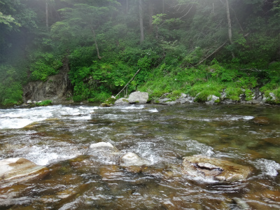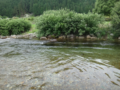 | かなり歩いて上がって行ったところ。良い瀬がありました!でも木が覆いかぶさって釣りにくい。6mの竿なら入れ掛かり!かも。 | 左の写真の下流側。石色も良く掛かる。3匹掛けて1匹しか取り込めませんでした。木には他の釣り人が苦労した痕跡がいくつかぶら下がっていました。 |