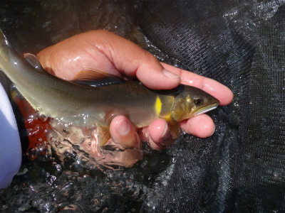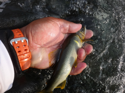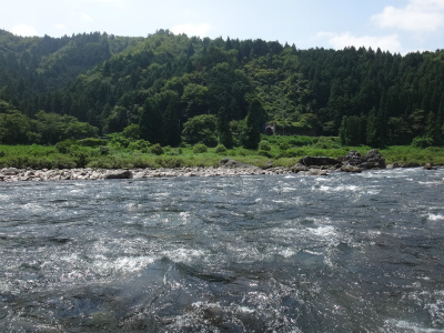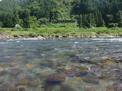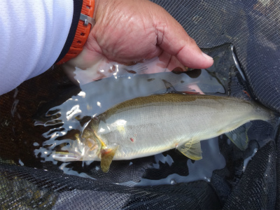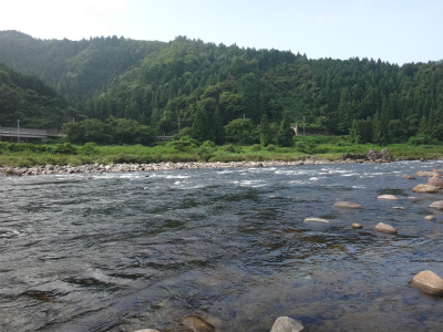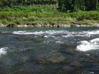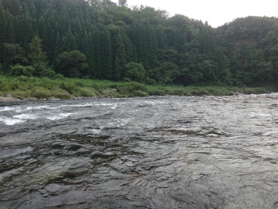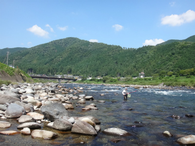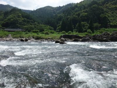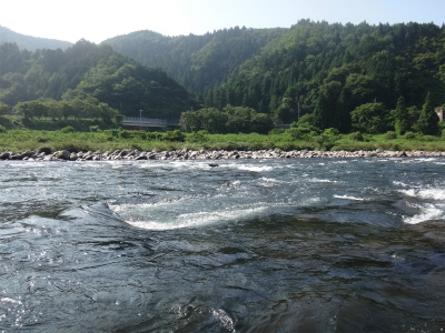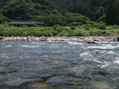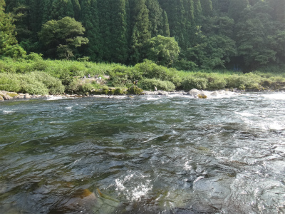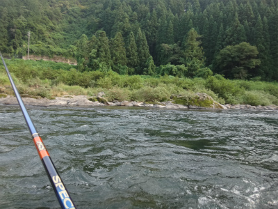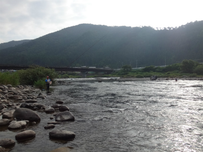 | 今日は社員会での日帰り旅行!ですが、夏は休みが取れれば1日でも多く川へ行きたいdeibuはわがままを言って川です。長良川中央も活性が出てきて楽しそう。いつものようにワクワクしてセットした目覚ましよりも随分早く目が覚める。下道をのんびり走り長良へ。途中郡上解禁とその後入った粥川出合いも良いかなと考える。ならば美並エリアの行ったことないところへ行ってみよう。美並インターを過ぎて目についた美並町三日市の鹿島神社前の村瀬おとりさん(だったと思います)でおとりを調達。周辺ぐるっと見て回り、もう一度おとり屋さんへ戻り、この辺りは初めてなんでどこが良いですか?と尋ねると、相戸の堰堤下の瀬は広く動けるで良いよ!と教えてもらい素直にそこへ。水曜日は結構釣り人が多い。国道からも良く見えるポイントで、いつもたくさんの釣り人が居ることだけは分かっています。 ここのポイント、川沿いの道路から見る流れは最高です。瀬には適度に釣り人が入っていましたので、瀬肩に立って開始してみます。ここなら瀬の様子も一目瞭然なのでベストでしょう。手前の筋から丁寧におとりを入れると簡単に掛かる。20pほどの良い鮎です。がタモから飛び出る!やっぱり新しい素材のタモは良く滑るのか何度か逃がしています。それでも3匹ほど簡単に掛かり、対面の方も掛けているのでこりゃ良いわ!とほくそ笑んでいたのもつかの間、モーニングサービスはそれだけでその後掛かりません。周辺ではポロポロ程度、瀬ではほとんど掛かっておらず、自分の前の瀬肩から瀬に入れても反応なく瀬はダメなのか?と同じ場所で粘る。それでも思うように掛からず時間だけ過ぎる。朝早くから瀬に入って居た方たちが休憩に上がったので、瀬に行ってみる。一歩前へ出てその方たちがやっていた先へおとりを入れるとドッカーン!掛かるじゃん!やっぱり瀬でも掛かったようです。岩盤横の筋ではこの時期にびっくりの26p170gも出ました。さすがに抜けず、30mほど必死に着いて下がってどじょうすくいを踊ってなんとか確保。プロポーションの良いすごい鮎でした。攻め時と見てお昼をずらして瀬を一通り探りました。強い流れに立たないと差せないタナでは入れ掛かりもあって13時までに15匹。 ダメだったら午後は中央へ下がろうかと思いましたが、瀬をまだ攻めきっていないのでここで1日やることにします。しかし瀬ではポツポツ。瀬が落ちて良い感じのタナがあり、そのタナから小さい深みに流れ込む瀬に入れると入れ掛かりに。マッキ色の良い鮎ばかり。夕方はトロ瀬でも良く掛かりました。まだまだ掛かりそうですが出荷しようと思い上がります。すぐ近くの出荷場へ持ち込むと、ダブつき気味なので常連さんだけ。一見さんお断り!漁協まで持って行けと言われてしまいます。漁協へ走ろうかと少し行くと事故らしく渋滞で動きません。諦めて〆ました。郡上も今が釣り時のようでかなり釣れているのでしょうね。しかし長良川良いですね。知らないところがまだまだ多く、色々行ってみたいですね! この日はラインを東レの将鱗あゆ 複合 METAL MIX0.07号を初めて使いました。RANやメタゲームと比べると随分細いですね。強さは偶然デカ鮎でも試せましたので問題なし。細い分良く泳ぐ気がします。針はオーナーの3本ツイストチラシ狐とバリバスの2本やなぎ仕掛けをメインに使いました。 錨と比べて掛かりが早い、遅いはあまり分かりませんでした。オーナーの方はケラレは何度となくありましたが掛かれば100%獲れました。バリバスの方はケラレが少ないものの針が小さかった(7.5〜7)のか身切れロケットが2回ありました。朝一は3本錨を使いました。今回のような太い瀬では掛かったらなるべく早く勝負を決める方がトラブルが少ないですね。一旦走られると難儀します。 |