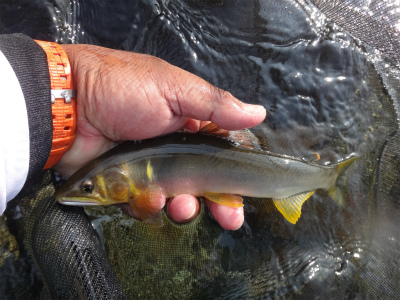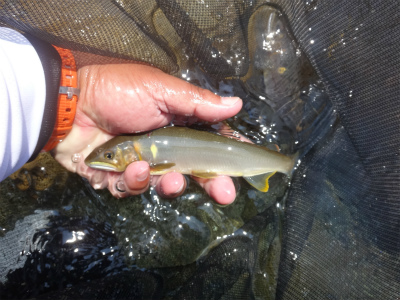 | 前回いっぱい居るのに掛からない鮎たちがスイッチオンになった感じでした。 | 夕方は対岸のおじいさんたちが居なくなったトロ瀬で連発! |