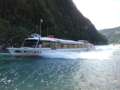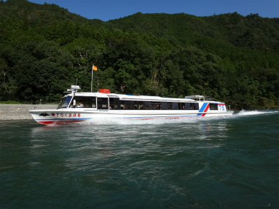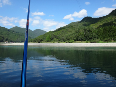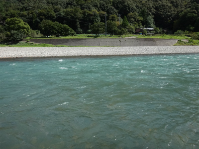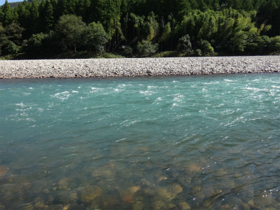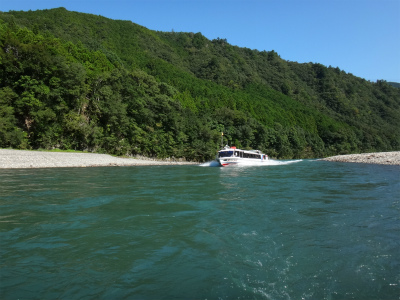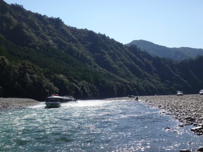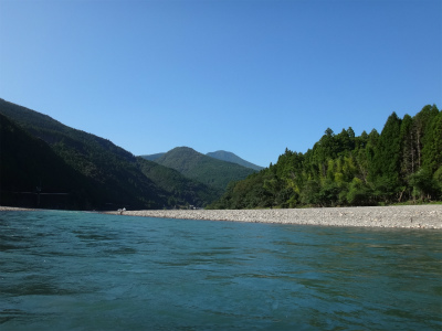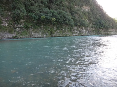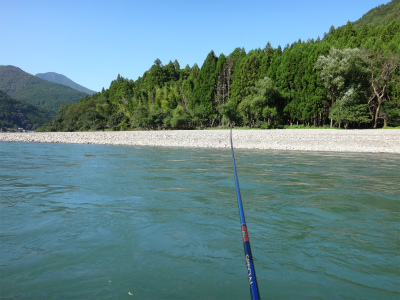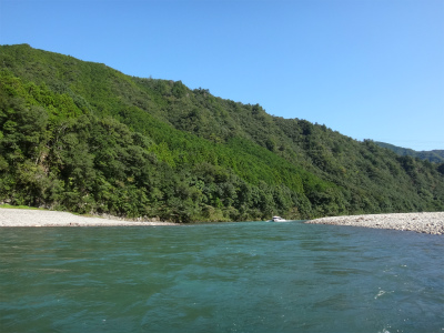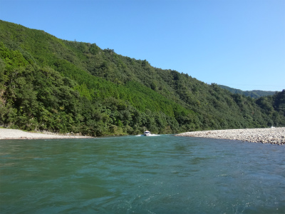 | ブオーン!手を振ってくれるお客さんには愛想よく!登りのときは出発後間もない場所なので皆元気ですが、下りの船の時は寝ている人も多い! | 北山川で面白いのはこういった深瀬です。押しが強く当たりも強い、もちろん引きも最高です。 |