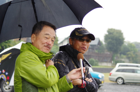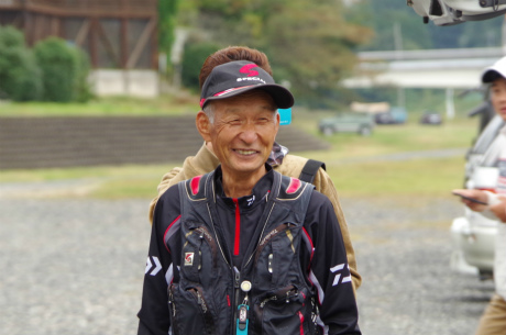 | 村田名人には多くのギャラリーが。前日、地元の方たちが立っていたところを狙っていました。さすがです。 | レジェンド戦を観戦中のつり人社、鈴木康友社長が小澤名人に解説を求めています。 |