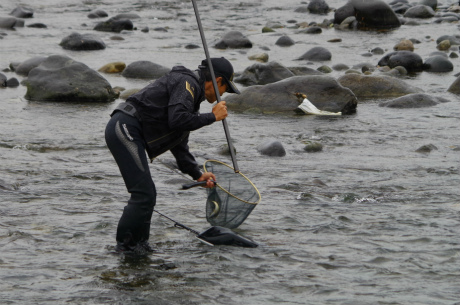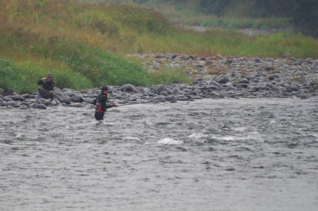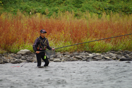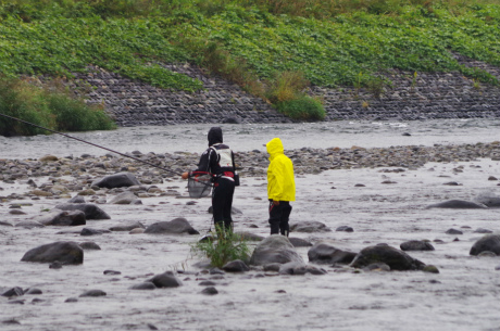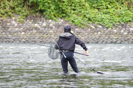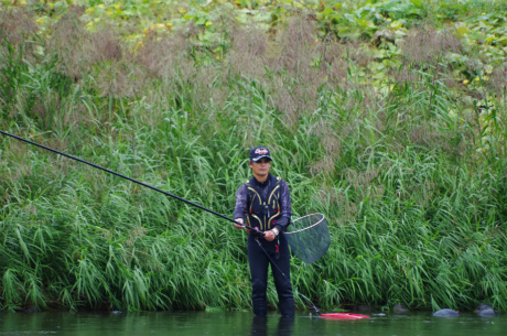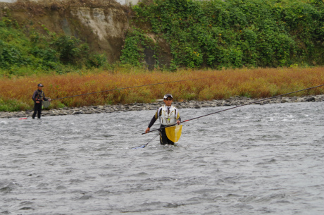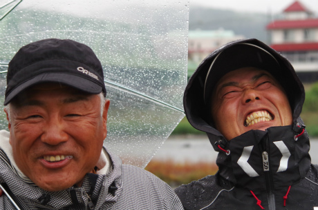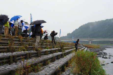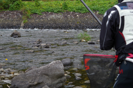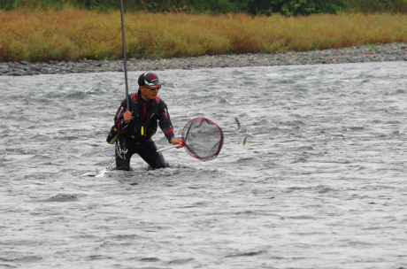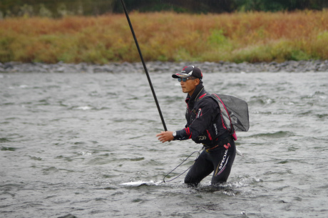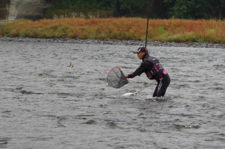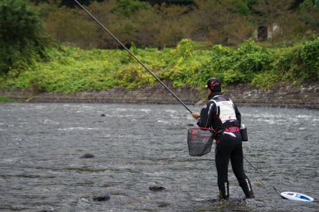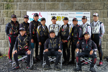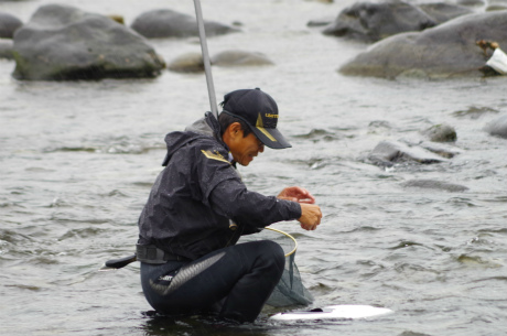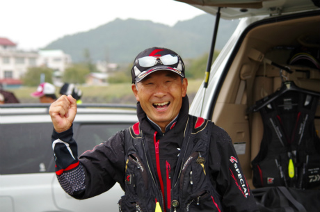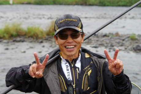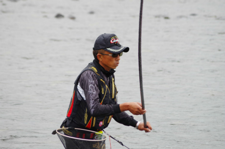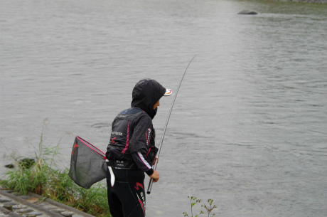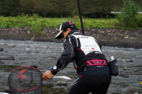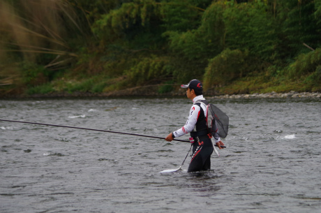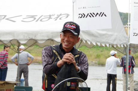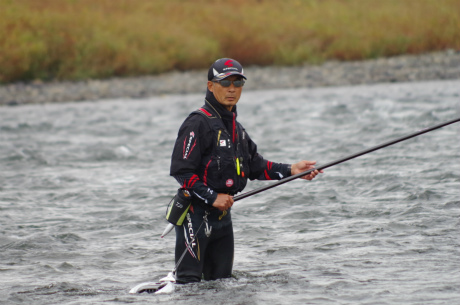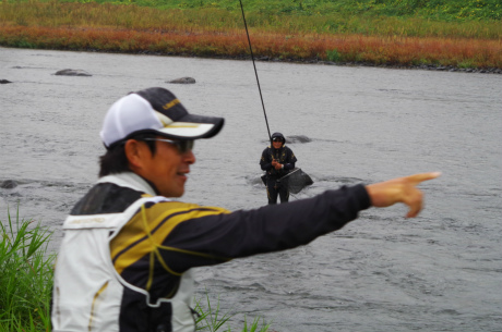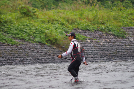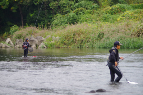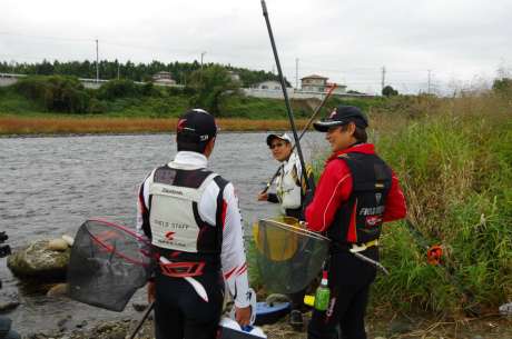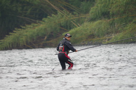 | 野島名人は瀬で真っ向勝負!迷いなし! | がまかつチームは全員でレジェンドの応援! |