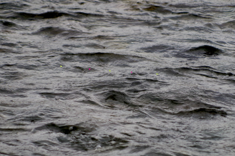 | 残り15分でおとりが替わり思わず笑みがこぼれる小沢聡名人。 | おとりが替わった後の小沢聡名人の目印。15分で4匹掛かる。 |
