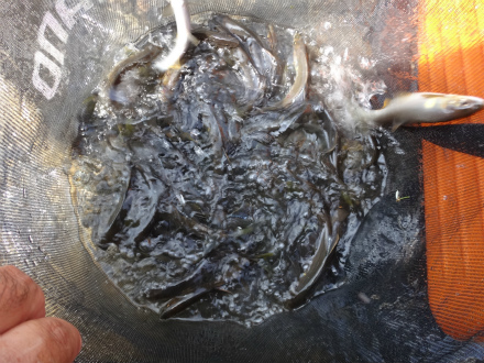 | 12日に矢作川釣行を段取りしていましたが増水で行けず、今年の鮎釣りスタートは今回の宮川上流解禁釣行となりました。前日入りして大原おとりさんの駐車場で車中泊。何度も目が覚め2時半に行動開始。3時過ぎに懐中電灯頼りに河原へ。明るくなるのを待ちます。寒くは無かったですが、寝不足で体がだるい。なんとか仕掛けが見えるようになった4時半、開始です。 水深へそほどの深瀬へおとりを入れていきます。今年の相棒、FWで当たりを待ちます。ビビビと追いを感じない弱い当たりでビリ鮎が掛かる。2匹目もビリ。廻りも掛かっています。3匹目でやっと追いを感じる当たりが出ました。その後単発の入れ掛かりはあっても爆発的な掛かりは無いままボツボツと掛かる程度。上下の瀬肩に入った師匠たちは入れ掛かっています。 9時に休憩。師匠たちは40匹ほど。私は25匹ほど。普段の運動不足と寝不足で集中力が出ません。ポイント移動する気力も無し。「この状態では掛からんやろな」と思いつつ釣っているようでは掛かりません。お昼までに40匹くらいか。午後はさらに遠のく意識と当たり。3時で限界、48匹でした。師匠たちは揃って72匹。周りの方たちも良く掛かっていました。 サイズは最大18cm弱の17cm前後が数匹、14〜16cmが半分強、それ以下が半分くらいでした。深いところ、浅いところ、大きい石、小さい石、瀬、チャラとどこでも掛かっていましたが、継続するのは深みが絡むところのようではありました。まだまだ初期で当たりも引きも弱い鮎ですが、黄色い鮎はいい匂いがしました。新しい竿を使いましたが、感想がどうのこうのと言うレベルではなく、ただ疲れました。今回は、なぜか例年ほどのワクワク感が少ない。年のせいでしょうか。6月の大会頃までには気力体力充実させていきたいです。 |