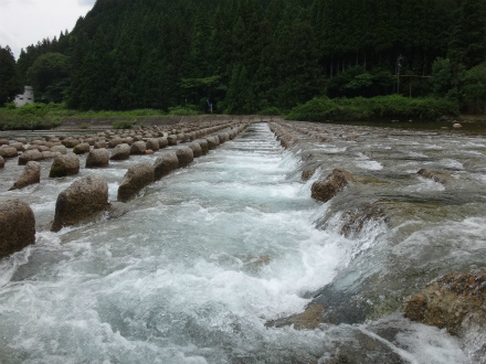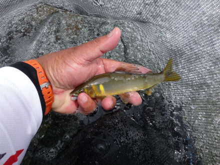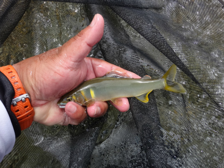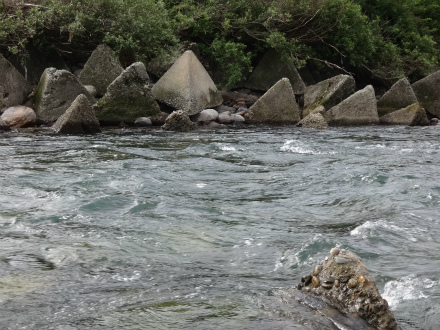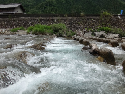 | いよいよ郡上の解禁です。昨年は郡上の解禁日に古座川へ行き、良い思いが出来ましたが、今年の古座川はまだ良くないらしい。長良川は中央も良い感じで郡上も期待できそうです。 さて、郡上へ乗り込む前に長良川中央区でやってみます。気になっていた本流、イカの瀬へ。行ってみると盛期はびっしり釣り人が並ぶポイントですが無人です。中央は釣れるなら必ず人が居ますので、これは厳しいのか。石色はまだ出来上がっていない感じですがやってみましょう。瀬の流芯に養殖おとりを入れると待つまでもなく当たり!で外れた。これは居るわ、と仕切りなおします。新しいラシュラン、チューブラーですが、おとりが流れに良く馴染みます。鋭い当たりで掛かった!でも12cmほどのビリ鮎でした。尾っぽが大きく尖っているので天然遡上かも。チビですがよく泳ぐ。ビリ4連発。ここではないのか。瀬の開きへ。良い石がびっしりの平瀬です。そこではビリも掛かりませんでした。鮎は居る感じですが、良型かどうかは分かりません。1時間半ほどやって板取へ上がります。 厳しいことは分かっているので、解禁翌日にクラブのN村さんが釣った場所を確かめに行きました。上牧橋上流にある低い堰堤。ジャパンカップ予選上限の上?だと思います。エリア外だと思うのでUPしました。その堰堤はテトラブロックで組んでありますが、その中段にちょっとした溜まりがあって、白泡で洗濯機みたいになっています。ここかな?と上からおとりを落とします。根魚のアイナメをブラクリ仕掛けで狙うような感じ。目印を水深ギリギリ程度にして、糸はまっすぐ!すぐにきました!まっ黄色!追い気120%です。鉄筋やら流木もあって根掛かりしそうですが意外にしません。1箇所1匹と言う感じで激しい追いです。釣り返しは効きませんでしたが、この日、この周辺ではめずらしい黄色い良型鮎ばかり10匹で満足です。変な先入観を捨てて鮎がいるところはどこか?と考えることも重要ですね。おとりや仕掛けなど関係のないぶち込めば掛かる鮎釣りでした。斉藤師匠も合流したので解禁の板取川上流を見ながら郡上へ移動です。途中で見た板取川にはいいサイズの鮎がいっぱい!これは釣れたでしょうね。 |