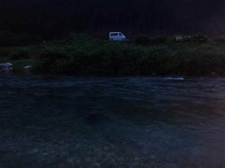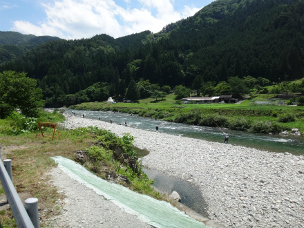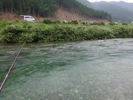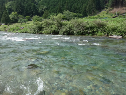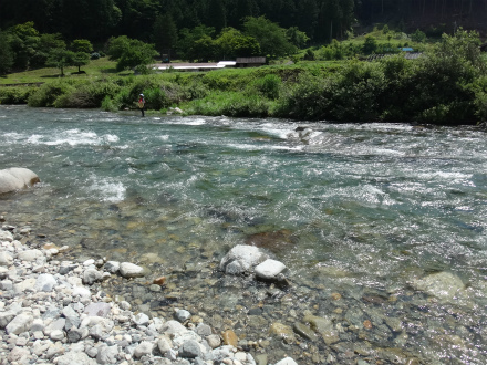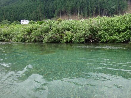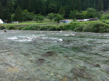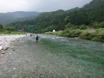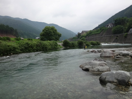| 3年連続の馬瀬川同じポイントで解禁です。2014年は渇水、昨年はやや多め、今年はちょうど良い感じです。過去の写真を見ると、このポイントは年々良石が少なくなって砂利が多くなっているようです。おとり屋さんで今年はお客さんが多い!と聞いて2時間ほどの睡眠で4時に川へ。解禁は楽しいですが、暗いうちからの場所確保はしんどいですね。来年はもういいか!と考えますが、懲りずにまた同じことをやっています。 さて薄明るくなって開始です。例年に無く暖かい。すぐには反応出ませんでしたが、ここぞ!というポイントにおとりを入れると反応あり!掛かりました。朝から黄色い鮎。例年より一回り小ぶりでしたが、タモいっぱいに広がる良い香り。最高です。下の斉藤師匠や、瀬の開きでは入れ掛かりですが、自分はポツポツでペースが上がりません。それでも良い鮎ばかり掛かって楽しい時間をすごせました。お昼までに39匹。師匠は60匹以上。見える範囲良く掛かっていました。 午後は師匠と場所チェンジしてもらい、数を稼ぎます。瀬の流芯では良いサイズの連発も有り合計66匹でした。サイズは最大で19cm、15〜6cmが主流、それ以下が1割程度ですが、全て黄色くなって掛かる、ヌメヌメの旨そうな鮎ばかり。皆さん満足されたのではないでしょうか。早めに上がり、掛川のじゃじゃまるさん、S田さんも一緒にめいほう温泉で汗を流し、駐車していた場所で夏は川漁師さんも合流して夜宴です。馬瀬にはコンビニがありませんが、黒石堰堤近くの商店は鶏ちゃんやとんちゃん、食料品、ビール、氷もあって便利です。鮎釣りにきたらまた楽しく釣るためにもなるべく地元にお金を落とさないと。充電完了し、雨も当たりだしたので8時頃には就寝でした。 |