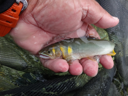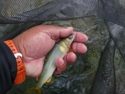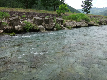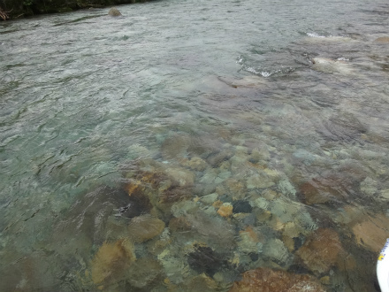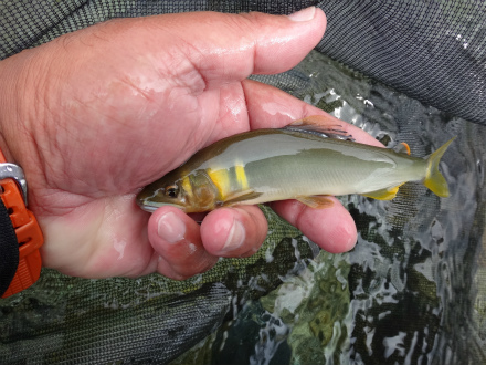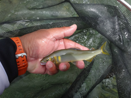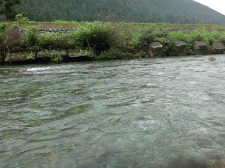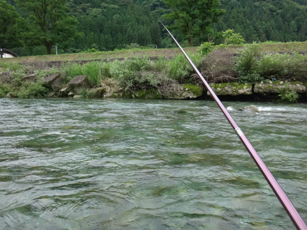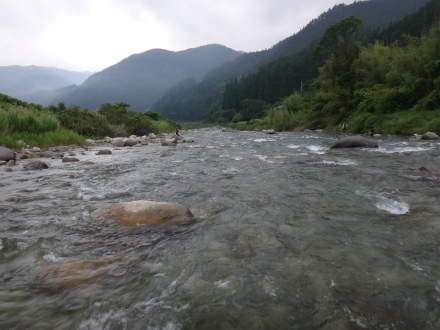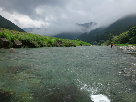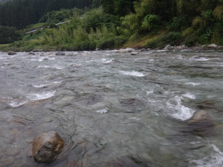 | さて二日目は違う場所へ。中スポ大会エリアを見ておきます。入ったことの無い診療所前付近へ。診療所上流エリアは一度ありますが、そこから下流のふれあい橋までは未経験です。 小雨、時折本降りの天気の中、瀬を探る。反応がでない。掛ける人の釣りを見ていると丁寧です。自分もトーナメントモードで真剣にやってみると掛かる。昨日のように引っ張るだけでは掛かりません。渋いときは師匠が強い。午前中36匹対19匹で完敗です。全体に小型。渋い追いと小型鮎、雨で心折れそうでしたが、昼から天気はよくなる!と前向きな師匠の言葉に鞭打たれ午後も頑張ります。 お昼終了時に缶を浸けた前の平瀬でチビですが黄色い鮎が掛かったので、午後はそこから。冷静に見ると石色が瀬より良い。昨日からの泊組み釣り人は、昨日で満足したことで、午前中の雨でほとんど居なくなりました。人気ポイントが貸し切り状態。午前中とは違う鮎が激しく追ってきます。石色が良いところを重点的に攻めていきます。薄茶色く輝くポイント狙い。砂利底でもあめ色石があれば鮎がついています。3時までの2時間で29匹。サイズ良し。師匠20匹。1時間延長戦開始。あと11匹釣りたい!平瀬、早瀬、強瀬、深場、浅場、ヘチどこでも掛かる感じ。11匹達成してまだまだ釣れそうでしたが終了。師匠は12匹。2日目合計師匠は68匹、自分は59匹。また負ける。敗因は「集中力の持続」です。気力も体力も持たない。次回のテーマは「集中力」!にします。 2日間の馬瀬川でしたが、期待を裏切らない解禁でした。鮎が群れておらず、川全体によく散っています。解禁は特定の場所で良い思いをする人が居る、という河川が多いですが、馬瀬川は放流場所近辺であればどこでも良かったのではないでしょうか。昨年より少し小ぶりではありましたが、質は最高。今シーズン初めて食してみます。丁寧な釣りと攻めの釣り。そのタイミングの取り方が重要かも。九頭竜川の下見と馬瀬川の下見。悩みますがやっぱり馬瀬川が楽しいかも! |