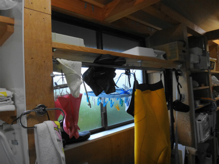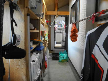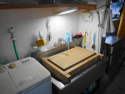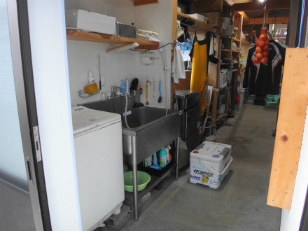 | deibuの小部屋です。家の土間は釣りを考えて作りました。勝手口を入ってすぐにクーラーボックスを丸ごと洗えるでかいシンク、2槽式洗濯機はタイツを洗い、タビの脱水にも使えます。そして製氷機は今シーズン35kタイプに変えました。中古で55,000円。大変便利です。 | 横には丈夫な物干しバー。 |