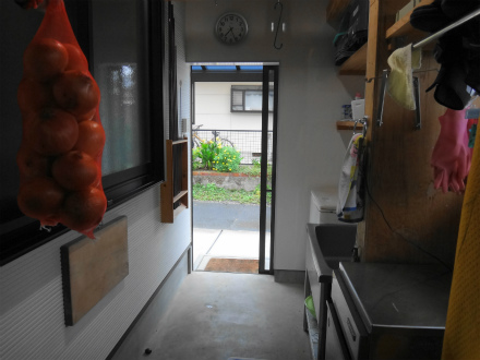 | 奥がユーティリティの入口で、洗濯機があるので、洗濯物はここへ放り込みます。 | お勝手口の外は道路ですが、うちで行き止まりなので、車横付けで荷物の積み下ろしが出来ます。 |