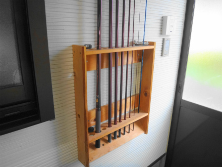 | シンクには魚捌き用の台(総桧!)も作りました。アオリイカもここで捌きます。捨てる部分は向こう側に落とせばシンクに溜まります。ちょっとゴツク作りすぎました。竿もこのシャワーを使って洗っています。 | 竿は毎回メンテナンスしています。竿乾燥台も自作です。(切断穴あけは大工さんに頼みました) |