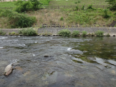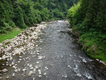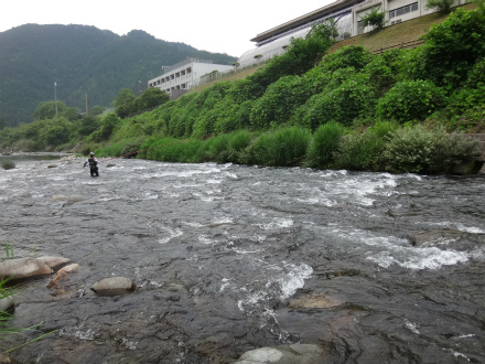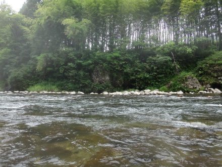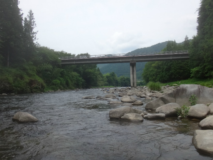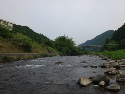 | 馬瀬川下流漁協鮎釣り大会は2011年に出場して予選敗退、そのとき以来の参戦です。今回も斉藤師匠が出場するということと、前日白川の大会出場なので近いし、それになんと言っても中スポ杯出場権がありますからね!それで出てみることにしました。 ジャパンカップ白川大会がスライドして被ってしまい、出場者は例年より少ないようです。予選は4ブロックに分けて行われ、自分は最下流のDブロック。そしてここでもおとり配布最後尾!配布順に関してはもう何も感じなくなってきました。ここは温泉施設がある道の駅で、昨晩車中泊したところです。そのときに川は見ていませんが、斉藤師匠が昨年の予選はこの場所だった、流れがふたつに分かれていて、左岸側が良く見えるが、去年は右岸側の流れで掛かっていた、との情報をたまたま聞いていました。 しかしおとり配布が最後なので入れるかな?と思っていたらまさかの誰も入らない!石色は良いし、釣りやすそうなのになぜ?中州からやってみます。 予選は11時配布場所帰着です。3時間半の長丁場。昨日の反省でおとりが替わるまでは引きすぎ注意!でも狙ったポイントで反応が出ないと引いてしまいますね〜。1匹目を1時間使って掛けられず。ヤバイ感じです。昨日の決勝ボウズの悪夢がよみがえる。トロの方が3匹掛けるのを見ていたので、トロ尻瀬肩の波立ちを狙ってみることにします。虎の子の2匹目おとり。これが元気で動き回る。泳ぎすぎて何度か引き戻しているうちにまた動かなくなってきた。これはまずい。懲りもせず、また流れに入れてみる。ギャーン!と掛かった。慎重に取り込んでボウズは回避。昨日の11時半以降、やっと手に入れた元気な野鮎。どうやって攻めようか。ここは慎重に瀬のたるみを泳がせて・・・何をやっているのか。失うものなんか何も無いのに。攻めねば。 流芯狙いでいくと下馬瀬は答えてくれました。ズッコーン!目印が1mほど消しこまれる当たり!23cmくらいのデカ鮎です。もちろんおとりに使います。ドンッ!からのギューン!堪らんわ〜。いい鮎ばかり掛かりました。おとりが変わったら5連発。掛かるとポイントが見えてきます。下側の瀬を探って2匹、最初にやった平瀬で3匹追加して込み12匹で予選終了。予選終盤は熱中症気味で気持ち悪くなってきたので、帰着場所の前に座り込んでやっていましたが、それが良かったようです。Dブロックトップで決勝です。 決勝は12:45から2時間、各ブロック4位タイまでと昨年の上位3名シードの方たちです。おとり配布場所から下流の橋までは広がったザラ瀬。橋から下流は徐々に狭まる流れ。狙い目が絞り難い広がった流れは避けて、橋下流の流れに立ちました。橋直下のザラ瀬から少し平瀬があり、そこには昨晩一緒に夜宴をしたA藤さん。その平瀬から瀬に変わる辺りです。予選の感触から、鮎は多く、瀬で掛かる。青黒く見えるやや水深があって流れが通ったところが良い。平瀬の中のそんなポイントに狙いを定めました。 昨日の白川決勝、今日の予選開始時の反省から、おとりが変わるまでは絶対に引かない、と自分に言い聞かせて開始。狙いたい場所ではないが、おとりが留まったので待つ。ギュン!意外に早く掛かった。良型です。攻めに転じる。流れの通った樋を通していくととんでもない当たりで掛かってくる。開始早々に4連発した。興奮してくる。下流にはよだれが出る流れが待っている。しかし竿抜けだったのか同じような条件の流れでも追いがない。空白の時間が過ぎる。なんとかこの状況を打開せねば。 ガチャガチャの瀬に落ちる肩を探ってようやく掛かった。ここは小さめ。やはり釣られた後は厳しいようだ。上に戻りながら探るが自分が釣ったポイントでは追加できない。 いつの間にか上にいた斉藤師匠が、開始時A藤さんが狙っていた平瀬尻で右岸側から掛けるのを見た。A藤さんは場所移動していったが、おとりが変わっていれば掛かったのかも。そこへ入る。残りは20分ほど。そのポイントは予選時終盤に3匹掛けた流れと同じ。やや緩い流れで青黒い筋が通っている。そこを狙った。おとりと同じようなサイズが掛かった。やっぱり予選時と同じだ。このサイズが掛かるところは多く鮎が居る。斉藤師匠の教えで、郡上の五町の瀬で開眼した「ふわふわ」させるテンションをキープすると面白いように掛かった。ここで5連発。結果これが勝利を呼び込むこととなった。込み14匹で優勝です。また中スポ杯に出られます 。 今回良かったところ 予選決勝を通じてバラシが1回だけ。(ハリス止めにちゃんと掛かっていなかったミス)これは竿がシマノ競FW+ソリッドでデカイ鮎の引きに追従できたことと、使用したがまかつの針、「全」(7号4本錨・ハリスフロロ1.2号)が良かった。針傷も小さく結構伸された場面でも身切れなし、バレもなしだったことが大きい。 鮎が大きいとメガトルク等の剛竿を使用する方が多いですが、自分の場合は水量が多い(熊野・長良川中央・九頭