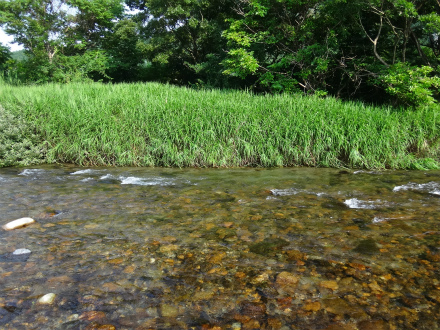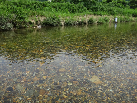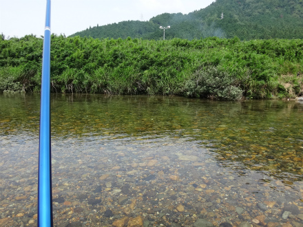 | FW+ソリッドでの釣り方が合っているのか。それとポイントを見る目があるか、を課題に大会参戦です。初めての板取川道場杯です。大会エリアはかなり昔に迎島バンガローで叔父たちと釣った記憶があるだけ。ほぼ初めてですが、少し下がれば良く行く中央区エリアです。なので想像がつく範囲で不安はなし。入川口が判然としないことだけが心配ですが、googlemapで川の構成を頭に入れておけばなんとかなります。 参加者は100名ほど。おとりを全員に配ってからよーいどん!でスタートです。上流をめざします。徐々に人が減ってきたので川へ降ります。瀬の終わりに出ました。すると瀬上のほうから続々と選手が。あっという間に目指す瀬は満員。瀬尻の落ち込み辺りを探ろうかと悩みますが、今回の課題、「川を良く見る」を実践するために安易に決めず見て回ることにします。瀬の頭付近には選手が降りてきた入川口がありました。その前は渡り場なので空いています。少し上のチャラ瀬際は石色が明るくいい感じ。小場所ですがおとり替えには最適かと判断。 すでに開始から20分近く経過していましたが、いいポイントが見つかった。おとりを入れるとよく動く。これは居ますね。ギューン!いい当たりでシュッとしたおとり頃が掛かりました。同じようにもう1匹掛かり、攻めに転じます。上下の小場所を狙ってポツポツ追加。渡り場はさすがに掛かりません。上のチャラへ。チビアユが多く見える。掛かりますがビリアユで循環が悪くなる。 上のトロも石色はいい。アユも良く跳ねる。そぉ〜っと行ってみる。砂利の筋と子供の頭大の石が詰まった筋が有る。そこを狙うと15〜16cmの天然遡上らしきまっ黄色アユが掛かり出す。なるべく竿下に置くようにゆっくり動かす。郡上五町の瀬でなんとなく掴んだ感覚を生かして釣るといい感じで掛かった。残り1時間ほどのとき、対面におじいさんがやってきてしまい、ポイント奪取されてしまうが、仕方なく動いた少し上がまた掛かる。全部追い気満々のいい鮎ばかりでした。やや小ぶりが多いですが、涼しく川に座り込んで静かに楽しむにはいい所だと思います。 帰着時間になり川を渡ると、よく掛かった筋は意外に水深がありました。釣っているときは膝上くらいかと思っていましたが、実際には股くらいまであり、改めていいポイントだったんだな、と理解しました。 そして予選中は下流の瀬の様子も観察していましたが、選手が良く動いていたので、爆発力はトロが勝っている。決勝ではトロ尻が勝負ポイントだと考えながら帰着です。検量結果は込み25匹で1位通過でした。 決勝プランは、優勝するには20匹をクリアしないとできないと考えます。適うポイントはあるのか。決勝はエリアが狭まったので、ゆっくりポイントを選ぶ余裕がありません。シード選手5名の後、6番スタートですが、おとり配布場所付近はいい石が多いが色が悪く爆発力は期待できない。渡りながらその上のトロもチェックするが暗い。右岸側のザラ瀬を見に行くと全体に明るく鮎は多い感じ。しかし全体に浅いのでどれほど出るかは疑問はあるがここにしよう。しかし皆考えることは同じで、上下竿1本しかない。動けない。これが一番苦手。開始までまだ時間が有ったので放浪しようか随分悩んだが、養殖でトロは攻めにくく、おとり交換だけはここでしようと開始を待つことにした。開始。おとりがきれいに泳いで流れを横切っていく。間違いなく掛かるイメージだが掛からない。さらに右岸際々を上っていくがまだ掛からない。と今度はおとりがどんどん流されていく。ビリが掛かったのか?違いました。なぜか分かりませんがおとりが横を向いてしまい使い物にならない。2匹目を使う決心が付かず動きました。 その瀬の頭、上には広大なトロ。しかし予選時選手が多く入っていたようで鮎は見えない。ここでも掛けられず放浪の旅です。結果は8箇所廻り4匹だけ。優勝はやはりトロを攻めた方が24匹で勝ちました。戦略は間違っていなかったが、それを見つける眼力がありませんでした。 決勝ウロウロしているときに優勝者の方が3匹掛けるのを見て、そのポイントを見ましたが、全般に暗い流れのなかで、その周辺は野球ボール大の石が多く、ピカピカでした。まずトロを良く見てから瀬に目を向けるべきだったかと反省でした。 しか〜し、参加者全員に何かが当たるお楽しみ抽選会では、奇跡的に自分の札が最後まで残り、43型テレビをゲット!奥様には喜んでいただけました。さて馬瀬川へ移動です。 |