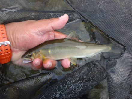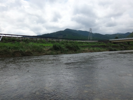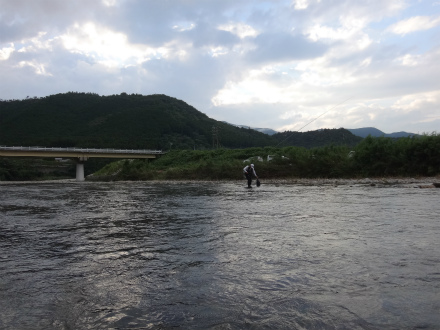 | 今回はフィッシング遊さんの社員鮎釣り懇親会に参加させていただく予定で郡上へ向かいました。途中美濃辺りは凄い雨!北の方はそう降っていないようだったので大丈夫かなと思い行ってみましたが、集合場所の吉田川合流点は増水濁りで不可、とりあえず吉野家で朝食喰って上流へ向かいがてらめだかさんに電話して状況確認。白鳥もすでに30cm増水で厳しそう。ならば馬瀬はどうか。神垣内おとりさんに電話、今はまだできる状況らしいので、とりあえず向かう。道の駅パスカル清見まで来ると川が見られますが、残念、濁りと増水が始まっています。これからまだ増えそう。トイレだけ済ませてF遊スタッフさんに状況報告、残念ながら中止決定です。 6時半、三重へ出発?途中高速美並辺りでは山から茶色い水が!危ない感じでしたが、その後やはり通行止めになっていました。東名阪渋滞にもハマッて大内山川到着は10時でした。大内山は晴天渇水、増人でした。朝から400キロ運転して疲れたので早飯喰って一服。朝3時起きで、郡上で朝食、清見でトイレ、遠回りで11時から大内山で竿だし!さて頑張るぞ! ポイントは人が少なかった阿曽大橋の上流。前回と同じですね。しかし状況は台風5号の増水で変わっていて、中州の草が無くなり、形も変わって瀬は白っぽい感じです。砂利が流れなかった石色が良い浅い場所から開始してみます。すぐに掛かる。連続で掛かるが前回と違い黄色くない鮎です。群れ鮎っぽい。それでも掛かれば面白い。Y田さんも合流。10匹はあっという間に越えてどこへ動こうか考えていると西の空が真っ暗になり、遠雷が。そして竿にピリッときました。風も出てきた。一時退散です。車に戻った頃雷雨。1時間ほどやり過ごし再挑戦。Y田さん、深い流れで掛けています。前回釣行時に楽しめた橋下流へ行って見ますが、垢付が良くない感じで、ヘチは緑と言うかグレーと言うか変な色です。掛かる気がしないという気持ちで釣るので余計につれません。2時間ほどうろうろして掛けたの1匹だけ!開始場所に戻って目印を下げ泳がせを真剣にやってみる。泳げば掛かる。開始時と違うのは黄色い鮎になってきたこと。夕方、人が減ってからは散々やられていたところでも入れ掛かり。24cmのデカ鮎も掛かった。6時過ぎまで頑張って38匹と満足な結果になりました。多分郡上ならこんなに釣れなかったでしょう!結果オーライと言うことにしておきましょう。 |