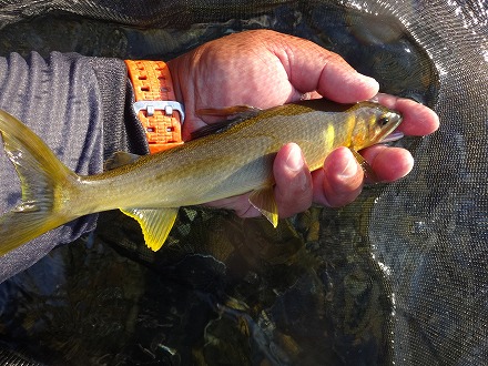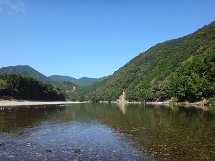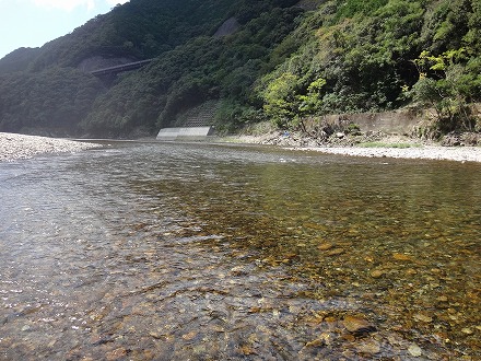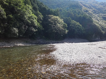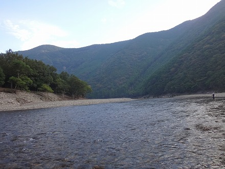 | 前回初めて行った日置川。ロケーションも鮎も素晴らしかった。そんな日置川釣行で一つだけ後悔したことがあった。ラシュランを持っていかなかったこと。同じ調子の広い瀬に点在する天然鮎を探しながら釣るにはラシュランが面白い。で、ラシュラン持ってもう一度チャレンジです。 最初に向かったのは、「中嶋の瀬」。日置川オートキャンプビレッジ横に駐車して河原を歩いていきました。行きは引き舟の中は養殖おとりのみなので、直線距離で目的地へ。途中にも良い感じの瀬がありますが、無視して行きます。やっと視界に目的地が。あれつ?先行者が。車は無かったが。。上のほうのトロにいます。その上には笹立てもしてあります。挨拶しに行って、入川ルートを聞くと、随分近くにありました。ガイドブックに載っていなかったので、えらい損した! 下のザラ瀬に入らせてもらいます。前回釣行よりダム放水が減って、渇水気味。くるぶしからすねほどの流れ。渇水でもラシュランで引きまくり。早く広く探っていく。良い感じに見えた右岸側のやや水深がある流れでは不発だったもののザラ瀬ではよく掛かり2時間半ほどで20匹は超えた。前回釣行よりサイズは落ちた。さらに上流にある「三ツ石の瀬」まで行ってみるか。今度は引き舟に鮎がそこそこ入っているので最短ルートは厳しい。砂利や砂で足が沈んで歩き難い川伝いで上っていった。確実に2人の足跡が気になりますが。 ダム濁りがほとんどなく、淵でも底までクリアー。とても綺麗です。途中に短い瀬がありました。ここか?木がかぶさる左岸側は岩盤、手前は砂利、流れ込む瀬には大きめの岩石が点在、いかにも良い感じ!ですが追いはさっぱり。鮎も見えない。ここじゃないな。まだ上か?行って見ます。見えなくなるまで続く広大なトロの終わりにありました。ここがどうやら「三ツ石の瀬」のようです。どれが3つの石なのか分かりませんが、大トロからの瀬、その下の棚が良い感じ。小石の瀬肩から。ビューン!と掛かったが連発はない。左岸際のキビしめを探る。小砂利の瀬肩にも明らかに白い部分が点在。これは釣り人が立った跡です。その位置を見るとキビしめのポイントも全て探ってある痕跡です。よって釣果もキビしめ。前回釣行の感触からすれば、竿が入っていなければサイズも良いはずですが、大きくない。長居は無用のようです。本命に見える棚へ。芯は白っぽい。掛からない。左岸ヘチキワ。掛かっても単発。この辺りは、大きめの石は、角張った岩石です。黒っぽいそれには鮎が付いていません。くっ付いて居るのはボウズハゼ。折角ここまで2キロ近く歩いてきたのに。戻ります。 「中嶋の瀬」には「近くから」降りてきた釣り人が3名増えて4人。やるところ無いので下流へ。朝パスした瀬で数匹追加して車へ戻る。往復4キロ。ヘロヘロです。夏なら無理ですね。ここまで31匹でした。ゆっくり休憩しましょう。車で移動を頻繁にする河川だとビール飲めないのが辛い! ぐったり寛いでいるととんでもない危機が襲ってきました!ブ〜ン!大きな羽音で近寄ってきたのは4cmはある大きなスズメバチ!子供の頃3回刺されて以来、大の苦手。釣っていると近寄ってくるときはありますがジッとしていればどこかへ行ってしまいます。ところが、コヤツは、歩きつかれて変なフェロモンでも出していたのか超接近!攻撃前のカチカチ音は出していませんが頭の周りをグルグル。すばやく動くと襲ってくるらしいので、追い払いたい衝動を我慢し目を瞑って早く立ち去れと念じるが。。。通じず。。。それどころか恐れていた事態が!ブ〜ンブ〜ン!ピタッ?音が止んだ。後頭部にトマッタ?絶体絶命の危機!なぜか川に飛び込もうと考え椅子を立ち上がり10m先の川へそろそろと向かう。またブ〜ン!飛んだ!まだ着いてくる。ピタッ!またトマッタ!もう川へ沈みたい一心!首から上は地蔵のようになった気分でそろそろ歩く!このときの自分の動きは多分傍から見ていたら爆笑ものでしょう。でも本人は必死!ブ〜ン!飛んだ!今がチャンス!走るか?幸いにも喰ってもまずいと判断したのか、噛まれることも刺されることも無く離れていってくれました。スズメバチには効かないと言いますが、このあとすぐに体がネトネトになるほど虫除けを振りまくったのは言うまでもありません。さらに疲れてしまいました。 そう言えば、前回釣行時は、日置川の車横付けポイントでは日中、車の窓を開けっ放し。さて疲れて車中泊。ブ〜ン!フロントガラスを飛び回る小さい虫。これは良くあること。ティッシュで摘んで外へ。ん?緑色のホームベース型。これくっさいヤツやん!摘んだらえらいことになるヤツやん!そして3匹もおるやん!1時間ほど費やしてやっとこさ退室していただきました。自然豊かな日置川では昆虫に注意ですね。 そんなこんなでヘロヘロのまま移動します。少し下流の漁協周辺には良いポイントがあるようなので河原へ降りていきました。しかし多くの釣