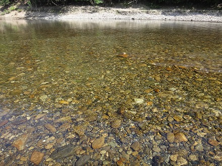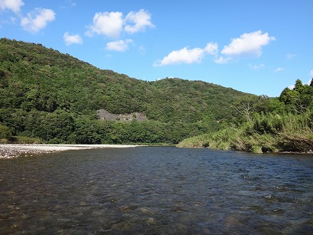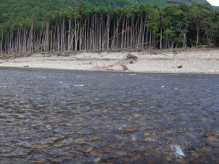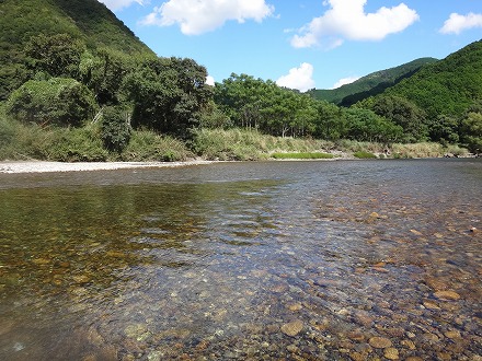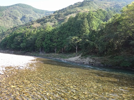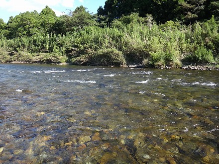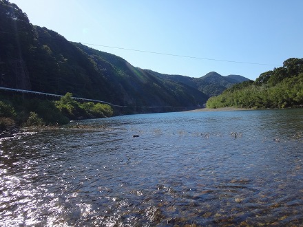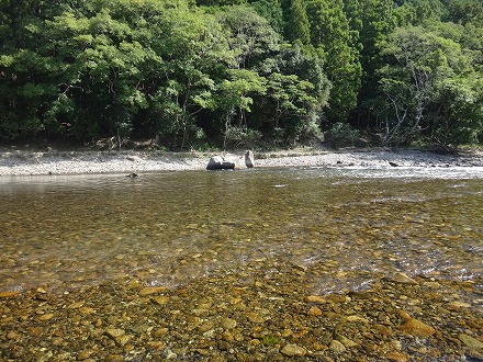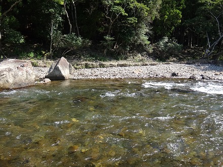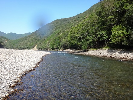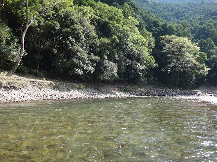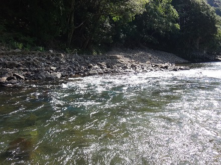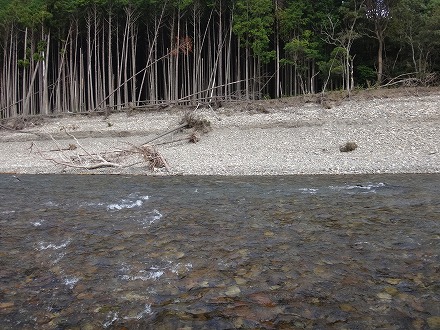 | 上流を望む。ここも笹立てしてありました。田野井橋はカーブより上です。 | ちょっと石色が悪いですね。日置川は茶色い明るい流れがグッド。 |