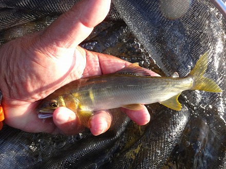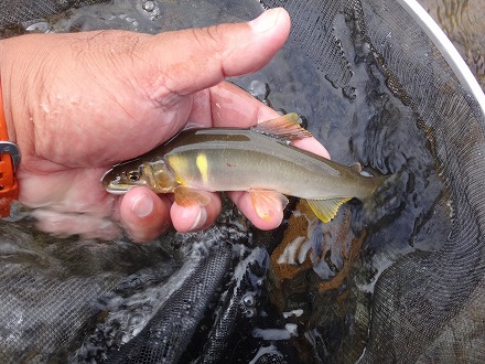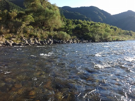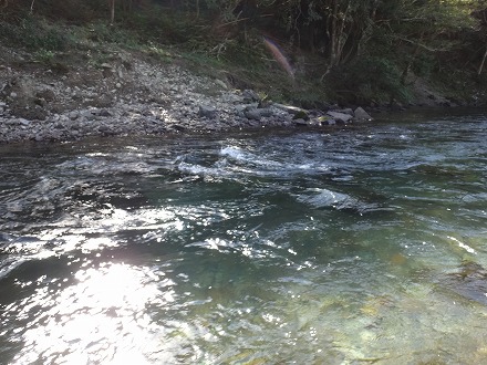 | 人気のトロに流れ込む辺り。テトラや倒木をこするくらいにおとりを入れるとギューン!答え一発!気持ちいい! | 夕方こんなのが8匹。日置川のいい締めくくりになりました。 |
