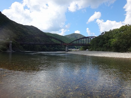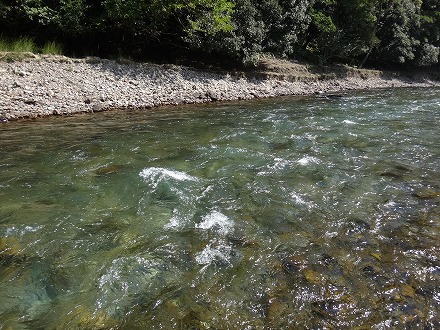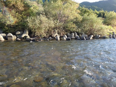 | オートキャンプ場と中嶋の瀬の中間にある名も無き瀬。雑に探りましたが掛かった。丁寧に探れば数が出たかな?と午後になって後悔した。 | 安井橋下流にある「イチョウの瀬」。ガイドブックには本命!と書いてあったが、この日は不調。確かにいい流れですが。ボウズで移動する。 |