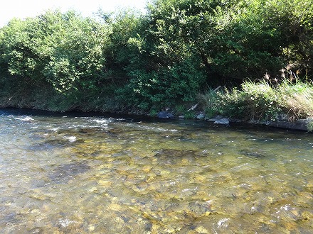 | イチョウの瀬から安井橋を望む | 田野井橋ずっと下流のポイント。トロから瀬に掛かるこんな流れから開始。黒い岩石で始めて掛かる。 |