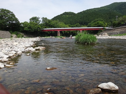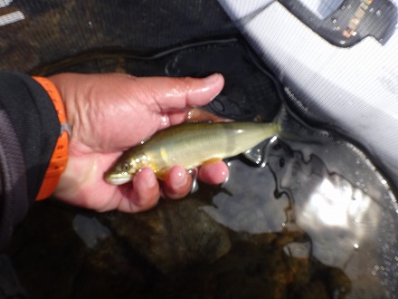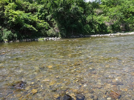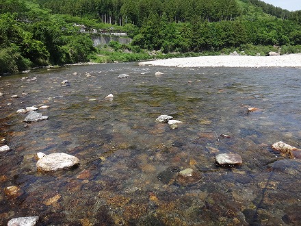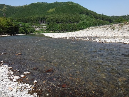 | 解禁日と同じように3時半に板取川河畔で目覚め、一旦家に帰ります。荷物を降ろして風呂入って日帰り釣行スタイルで大内山へ向かいます。久居を過ぎた辺りでベストを忘れたことに気付く。また戻る。大内山到着は8時半頃。釣り人は上流部に集中しているので下流域はガラガラ。目指す阿曽大橋には広い上下ポイントを見渡してつり人1人だけ。ハルさんでした。クラブの例会ということで邪魔しないように橋下流へ。 橋下流瀬肩には掛けられそうも無い鮎が多く見える。ザラ瀬をやってみるが1匹掛かっただけ。ウロウロして探っていくが掛けられない。鮎は浅場でも結構見えるが縄張り形成していない鮎ばかり。ヘチなどは石もピカピカですが、どうも天然遡上のチビ鮎たちが磨いているようです。午前中は2匹掛かったのですが、貴重な1匹をツルッと逃がしてしまい釣果1匹!板取の方が良かった? どよ〜んとした気分でハルさんの様子を伺いに。なんと11時頃までに30匹も!例会集合で上がるとのことなので、午後は勤務明けで参上した月光仮面ことおまけ君とその周辺を探りました。石の間を縫うような泳ぎのおとりには野鮎が反応してきます。1匹掛かると2〜3匹続く感じで夕方まで粘る。20p級も混じり21匹でした。おまけ君も同じ程度だったようなので、ここだけで50〜70匹も釣れたことになりますね。一雨降ってリセットすれば下流域も良くなると感じさせる1日でした。 |