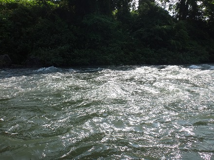 20p高いだけで結構な流れになっている。時間はまだ半分近くある。6匹くらいなら簡単だ!目印を目一杯上げて弱った養殖おとりを流芯へ滑り込ませる。ジリジリ下がるおとりをだましだまし留めて待つ。かなり待った。ギュギュギューン!よっしゃ掛かった。慎重に取り込む。18p程のまっ黄色。替えて送り出す。流芯下にスッと入っていくと一発でギューン!また黄色い鮎だ。これは掴んだぞ!3匹目も簡単に掛かる。おとりに余裕が出来たので、落ち込み白泡の瀬を狙う。これが良くなかった。