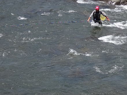 すでに20分以上経過。ボーダー込み8匹程度と予想、なんとか6匹を釣ればいいのだ!と自分に言い聞かせて開始。おとりが流芯の下に滑り込んで留まったのでそこで待つ。良い感じですが掛かりません。対面の選手もいい所を攻めていますが掛からない。まだ追いが出ていない感じ。流芯脇のたるみを探る。絶対に居ると思うのですが掛からない。開始1時間が経過して気配も薄いので移動。しかしおとりを入れたい場所が見つからない。また右岸へ渡ってウロウロ。薄濁りで見え難いしズルズルなので歩き難い。すると入りたかった深瀬が空いている。行ってみます。