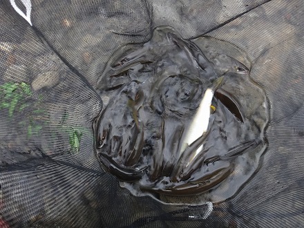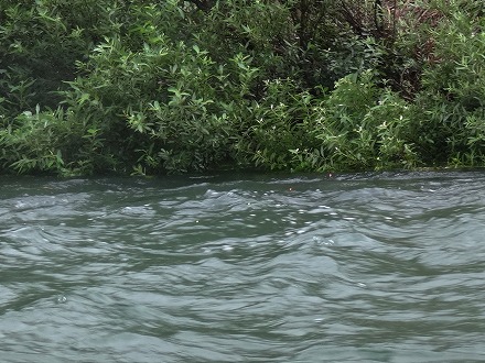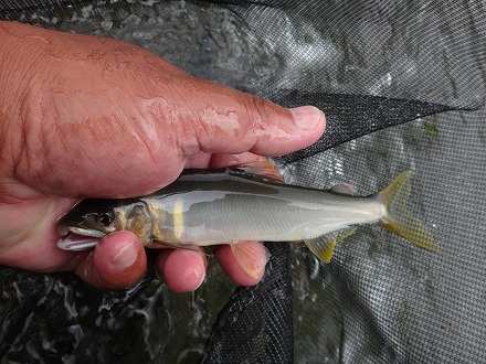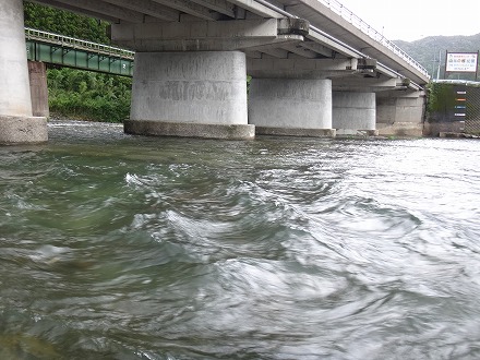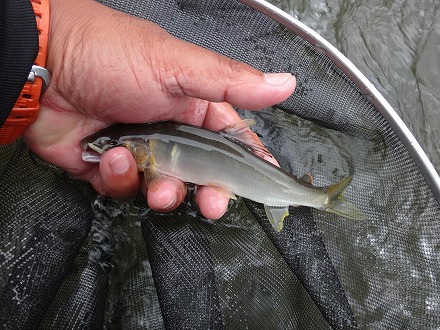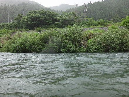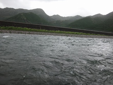 | うまい中華そばの一冨士若旦那、こてつくん中心の条件が良い時しか釣らないぞ!のメンバー、「好条件戦隊」とそこに集うメンバーで開催している「第10回!2018夏の陣★好条件CUP★大内山川大会」に参加しました。なんと今回で10回目なんですね。ノリで始めたにも拘らず、今回は40名も参加です。一冨士が水曜定休なので開催は水曜日、「濁らなければ決行!」という開催規定に基づき、台風なんのその。予定通りに開催です。 釣りえさ市場に集合しておとり配布後、大内山川本流エリアはどこでも可、12時までに検量を済ませるルールです。 雨は小康状態でしたが、南よりの爆風がすごい。川が東西に流れているところなら風裏かも?と考えて岩船橋下流へ。しかし竿を延ばして仕掛けを張るのも一苦労するほどの爆風!風は川伝いに蛇行する!竿はもちろん風に強いラシュランですが、それでも風で大きく曲がってしまう状態でした。しかしおとりを送り出してすぐさま変化が?あたりは取れません。お!掛かったぞ!遡上モノらしき15p程度の小型鮎です。水位は30p高、薄い濁り、鮎が溜まっているのか?しかし同じ場所で掛からない。4匹掛かって1匹落とす。全部小型。どう掛かるのかが分からず攻めようもありません。ただひたすら爆風の合間を縫っておとりを落ち着かせることに精一杯。それに草木も流れてくるので大変です。徐々に下がって行くと黄色いおとり頃18pが掛かる。これはいいかな?でも爆風と草木ですぐに弱らせてしまい攻めきれない。風がなければ絶対に掛かるパターンですが。徐々に瀬に入っていく。2匹目養殖おとりで瀬肩パンツを攻める。爆風でも明確に分かるギュン!という当たり!良型や!堪える!爆風で竿が煽られて大きく曲がってピンと戻ったときに切れました。あ〜ぁ。瀬にはエエのが居るのは分かったが攻めてがない。目印を目いっぱいまで上げて、超ベタ竿で瀬を探っていくとまた掛かった!まずは大きく竿を曲げてから風をかわして何とかゲット。20pの良型。これが瀬をぐいぐい上ってくれますが掛からん。そして弱る。良型の弱ったおとりは使い物にならない。まだ養殖おとりの方が使えます。だましだまし攻めているとまた掛かった!ために掛かるとブチン!水中糸があっけなく切れた。何度も草木が絡んで解いてをやっていたので痛んでいたのでしょう。2ドンブリは痛すぎる。橋すぐ下流へ戻ってだましだまし探って1時間勘違いしたタイムアップを迎えた。11時帰着と思い込んでいたので10時40分に終了。結局込み7匹でした。 優勝は阿曽大橋下流で14匹釣ったYさん。竿折が3名?過酷な大会でした。検量も和気藹々と進み、豪華な弁当までいただき、全員に当たる抽選会ではプロが完璧に裁いた猪肩ロースゲット。そしてこの日釣った天然鮎は伊勢神宮の奉納に続き、瀧原の宮に奉納されました。(その様子はコチラ)この大会にも参加の渡辺組合長によれば、まずは大内山川の鮎をブランド化して、次はその鮎の販路を築きたいそうです。そうなれば釣り人が釣った鮎の買取りも出来るようになる、と考え行動しているそうなので、期待したいですね。 大会が終わると爆風も強風程度まで落ち着いてきました。夏は川漁師さんが大会時、小広瀬橋で掛かった、まだまだ掛かりそう、と言うので行ってみました。川漁師さんの小広瀬橋上から的確な指示をもらいおとりを入れていくとギューン!エエ当たりや!平水なら泳がせポイントですが、+30pでいいトロ瀬です。じわじわ引くとドーン!ここは型揃いで18〜20pばかり。20p超えも混じる。ただどこでも掛かるわけではなく、大きめの石に付いているようで、その周辺に行くと掛かる。それでも広いポイント貸し切り。雨も降り続いていましたが、水温は高く、濁りも消えていく方向だったので楽しめました。4時までやって19匹。お土産確保で納竿です。 大内山川ですが、遡上鮎もかなりいますね。放流鮎も元気です。雨に強いダム無し大内山川、しばらく楽しめそうですよ。 |
