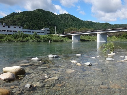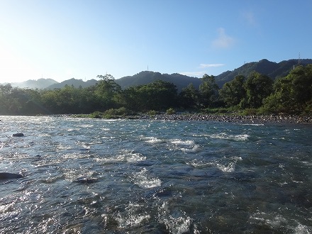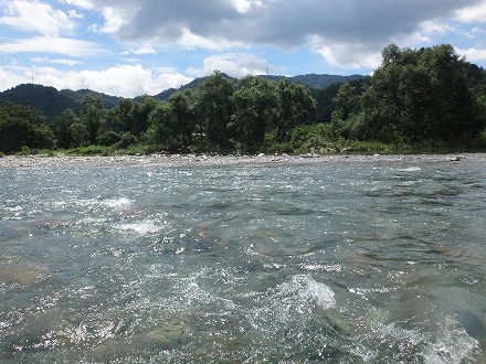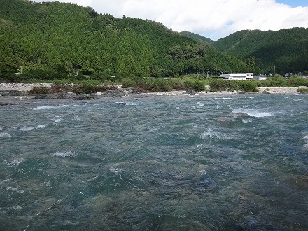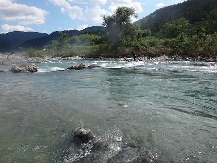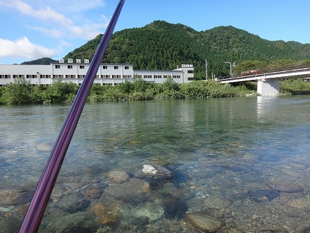 | 日帰り釣行。郡上の予定でしたが、板取川も釣れているようなので途中下車です。専用区で、と思い睦橋下流に入ってみました。ここは駐車スペースが少ないので、ほぼジャパンカップ予選の時しか入ってことがありません。先行者お二人。トロと瀬へ入られました。 気になった瀬は空いているのでやってみます。川の状況は台風20号の増水からの引き水で、垢は6割方飛んでいる感じ。瀬は白っぽく見えますが、手で触るとヌルッとするので垢は残っています。おとり4匹なので、瀬にいる場合は絶対に居るだろうと思う流れに入れて待つ。待つ。15分待っても音沙汰無し。気配を感じません。下流の方も掛からないままどんどん下がっていきます。こちらは徐々に上がりながら探る。瀬肩のいい波立ちも反応ありません。1時間タコ。郡上へ転戦か?しかし右岸柳際を狙っているトロの方はポツポツ掛けています。橋下流のトロ左岸を見てみると鮎が見えました。なるほど。ここか。 居る場所は分かりましたが次は養殖おとりに反応してくれないので悩む。泳がないので吊下げてあちこち探っていくとようやくチビが掛かってくれた。それを超慎重に操作するとやっと追ってくれた。ヘチは石が並んでいますが、少し先は砂利の中に石が点在する流れ。それでも広く泳げばシュッと追われます。細いですが尾っぽのデカイ黄色い鮎。タモに受けると良い匂いです。元気おとりを下流に送り込んでじわじわ引きあげてくると良く追われました。昼まで17匹。サイズは16p主流、最大18p、チビは13pでした。 めずらしくトロで長時間我慢できましたが、限界に達して午後はプリモ前へ。上牧橋下流も結構な人出。プリモ前も日曜日かと思うくらい人多い。ここはえらく流れが変わっていました。右岸の駐車スペース前から右岸側が広がって横に3人並んで釣れるほど広くなっています。上の堰堤からの瀬へ。やや高水で良い感じ。ここは流れに変化無し。少し白っぽいですが、右岸からザラ瀬に入れてみる。ゴソゴソッ!ギューン!でおとりサイズが掛かった。トロでは味わえない前アタリというか、この野鮎の気配が良いのです。 変えて送り出す流芯にビタッと入ってくれる、とギューン!連発する。これは天国モード突入か?鼻の穴広げて構えも前のめりになる。ジワジワ引き上げる。ジリジリ、ジリジリ、掛かりません!では広く探ってみる。やっぱり掛かりません。誰かが抜いた後なのか、垢が付いていないのか分かりませんが、渡って反対から探ってもダメ。 左岸側にある浅トロはどうか。ここは石が小さく垢が無い。そのまま分流を見に行くがここは掘れて岩盤むき出しで魅力半減。掛かりません。そのまま合流点付近を探る。たまに掛かるがここは白い鮎ばかり。黄色いデカイ鮎はどこだ!岩盤筋へ突進する。白泡筋におとりを引きずり込んで待つとゴン!当たりでデカイと分かる。ここに居たのか。攻めにくそうな筋を探っていくと良型ばかりだったが、入れやすいところでは追い無し。やられた後感がありました。午後は失速して11匹。睦橋付近のトロでじっくりやってい「れば」、数は伸びたかもしれません。板取川、天然遡上が黄色くなって追うので、良い場所を発見できれば楽しめそうな感じですね。もう少し垢が付けば小石底の浅トロなんかも面白くなる気配も。また来たくなる釣行でした。 |