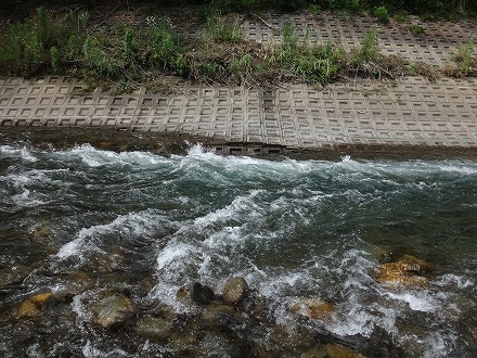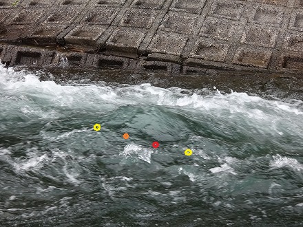 | 1個目と2個目のテトラの間の流れ。結構押しが強い。馴染めば少し待つ。するとエエ当たりが出た。 | 瀬落ちはこんな感じでおとりを入れた。目印は竿節2本分が一番下。ベタで引き込む。 |
