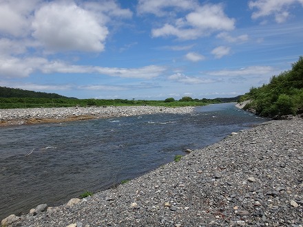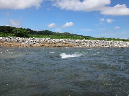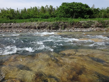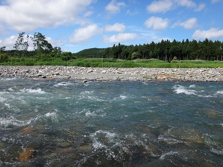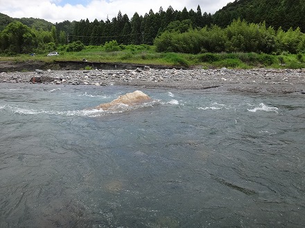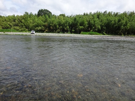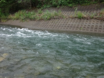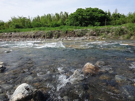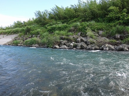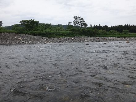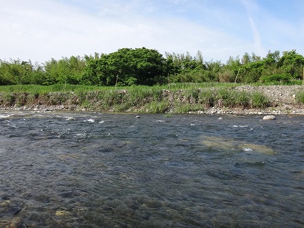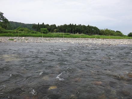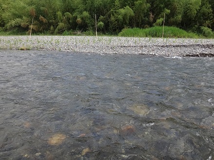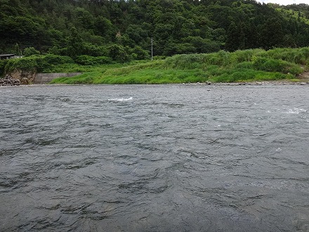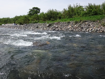 | こんな良いポイントでも散発。絶対数が少なく感じた。 | 昨日やった瀬の上、棚尻を静かに探ってみると良い感じで掛かりだしたが、長くは続かなかった。 |