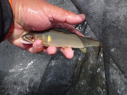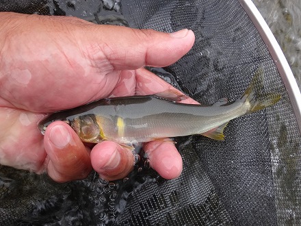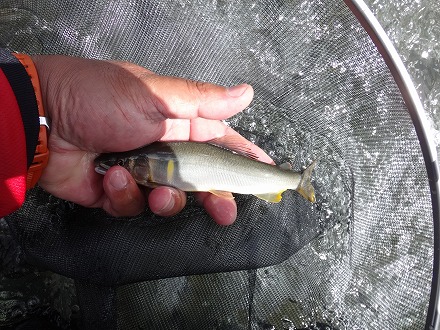 | 午後は両台橋から続く長い浅いトロからの瀬にかかる変化を探ってみる。 | 丁寧に待って待ってやっと掛かる。せいぜい1箇所で2〜3匹。広く探らないと出会わないし、待たないと掛からない。難しい釣り。 |