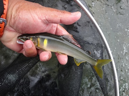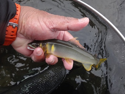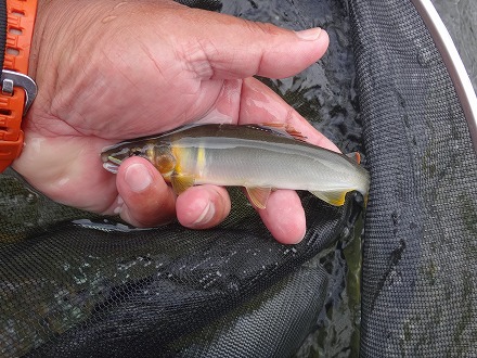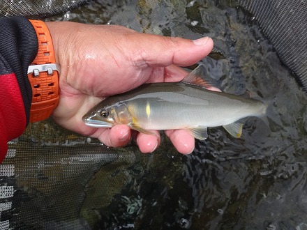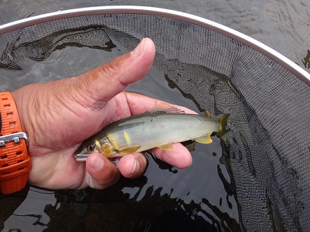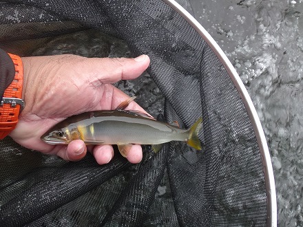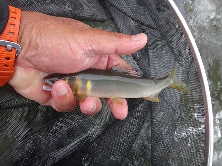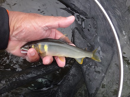 | 徐々に立ち込んでいくと気持ちが良いアタリが続く! | トロの鮎はまっ黄色ばかり。水深があるので引きも楽しいです。 |