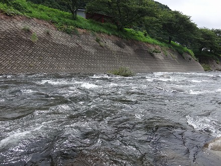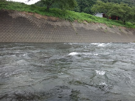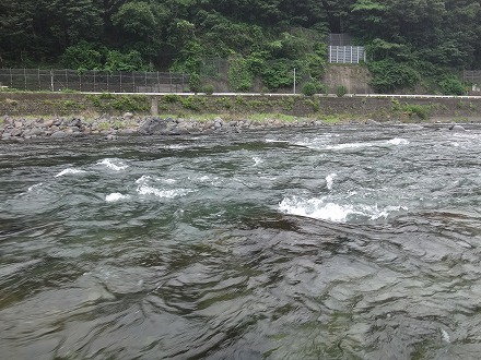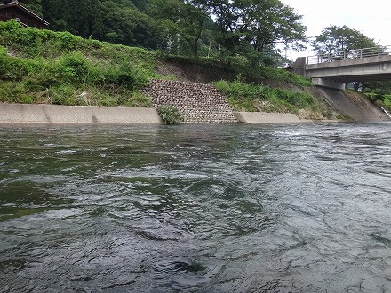| スロープ前の人気のトロ尻を探ると入れ掛かりに!ええ鮎ばかりでした。 | 左の写真のようなトロ瀬が良いなら・・・と目論んで移動した先がこちら。西河橋上流のトロです。平水より20㎝以上高く良いかんじ。まずは右岸よりのこの岩の横を探ってみると一発でギューン! |