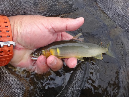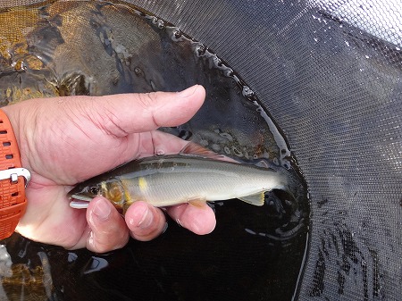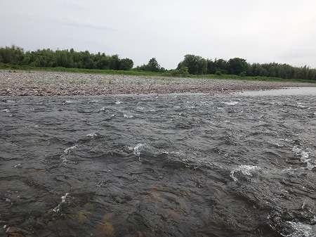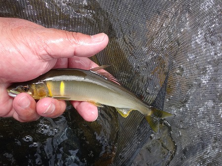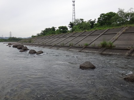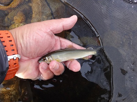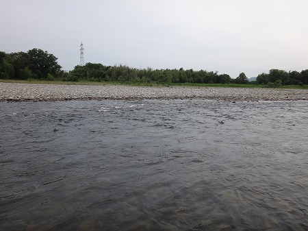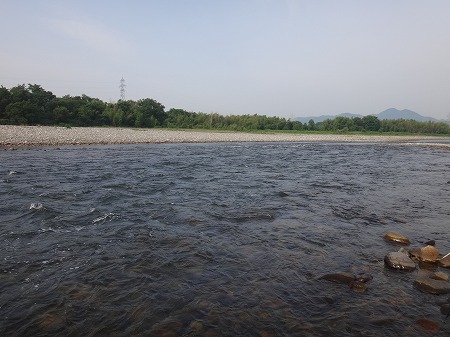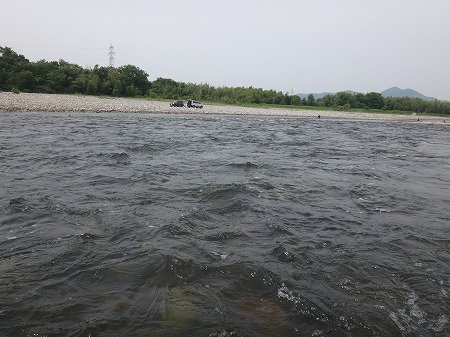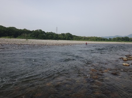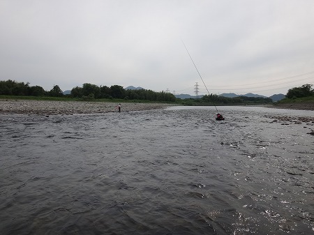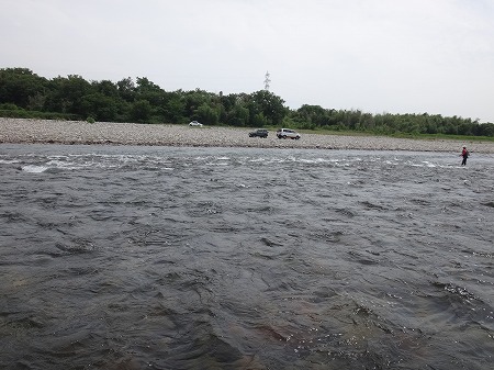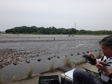 | さて明日はどこの川へ行こうか。ストレスフリーな釣行です。朝4時出発。家の近所の道路で夜間工事をやっていて、通りに出るところで左折は出られない、右折ならOKとガードマンに指示される。右へ行け!は長良川ってことだな。今日は長良川中央に決定!矢島さんで年券購入。矢島さんの前、堰堤下流域や御手洗を覗いてみるがピンとこない。榎本師匠が御漁場は「釣れる!」と言っていたので行くことにする。千疋大橋下流にあるテトラ堰堤下流です。 7時過ぎ、一番いいと思う流れに馴染ませると秒殺で掛かった!12p位のビリです。替えて出すとまた掛かった!14p位の兄さんになった。替えて出す。元気なおとりで瀬を軽く引ける。沖に出ないように手前の筋を引きあがっていくと前当たりからのギューン!最高だ。18p程の良い鮎が掛かった。その勢いは止まったが、流れ全体に鮎は付いていて、反応が出てからのシュッとした鋭い当たりで掛かるのでチョー面白い釣りだ。14pくらいのおとりだと反応が良くて、3、4匹に1匹掛かる良型をおとりにするとチビが追わないので少し時間がかかる、といった感じ。でも石の詰まった良い流れで反応を感じながらの釣りは最高に楽しかった。11時までで31匹。9時頃やってきた和人君も2時間ほどで10匹くらいサクッと釣っていました。 午後の滑り出しも快調で調子よく掛かるが、2時頃にピタッと当たりが止まった。13匹追加出来てあと6匹で50匹。集中力も切れ掛けていたのでもう一度休憩。1時間昼寝する。そろそろ良いかな?小場所をチェックしてみるが、鮎は居るのに追わない。瀬へ戻っても釣れない。あまりおとりを動かさず釣っている方はポツリポツリと掛けているが。6匹ぐらいなら簡単だろうと思っていたが、なんと2時間で3匹だけ。それもビリ。ちょっとスッキリしなかったが、ツ抜け目標だったのが50匹目標にできるほど釣れたので良かったです。 感じるに、2時頃から当たりが遠くなったのは鮎が居ないわけではなく、追わないだけのようです。宮川下流でも鮎はわんさかいるのに追わない。同じように見えました。今年の長良川は魚影が濃さそうなのでまた楽しませてもらいます。 |
