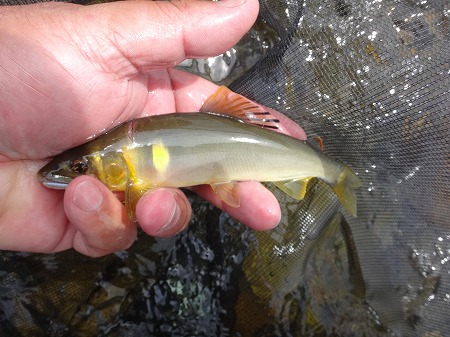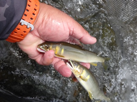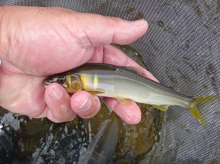 | ガチャガチャの流れもやってみた。すぐに反応出たが掛からず。その後散々探って掛けられず、おとりを見たら針が無かった!「動く、動かす、チェックする」友釣り三原則、怠ると釣れません。 | ビリビリも入れて47匹。十分です。 |
