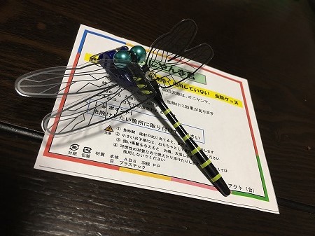 見つけたのがこれ!「おにやんま君」。オニヤンマもスズメバチの天敵らしく、これをぶら下げていると寄ってこないらしい。早速購入して防止に止まらせました。果たして効果のほどは?検証します。 |