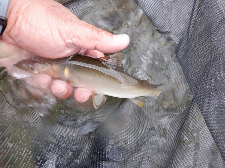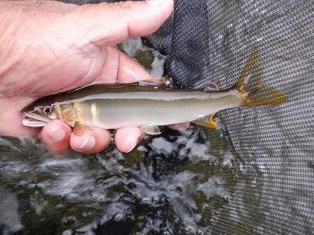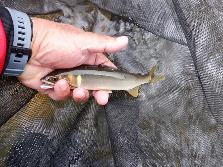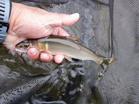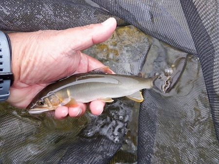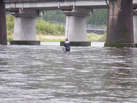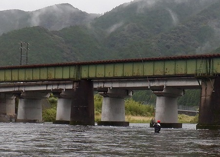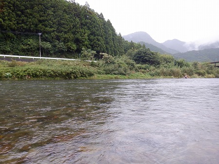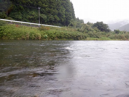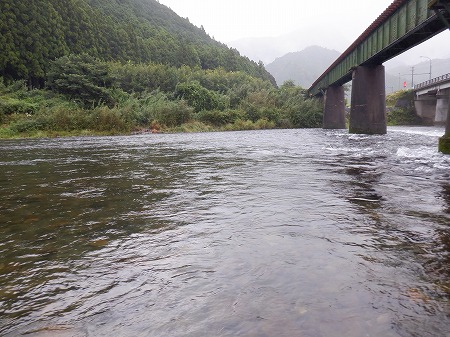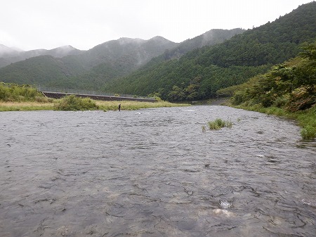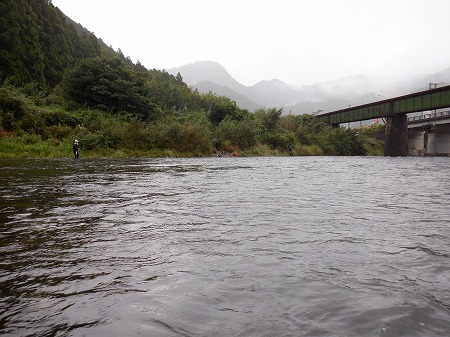 | 雨予報ですが休みが取れたので専用区期間も残り少ない大内山川へ。正確な予報で、おとり屋さんではすでに雨。前夜結構降ったようで、水位は岩船橋下流で+40pくらい。濁りはありません。瀬は厳しそうなので鉄橋上の平瀬が狙い目か。今日はこてつさん、ハルさん、フィッシング遊のSさんも集合です。 7時半、鉄橋上流は川幅が広いので+20〜30pでいい感じ。右岸際にも鮎が結構見えます。まずは瀬への落ち口ギリギリへおとりを入れてみると速攻で掛かった。同じ狙い目で2匹、3匹と掛かったが、3匹目が大きくてピーヤ付近まで持って行かれて、水中糸に絡んでしまいプッツン。モーニングは6匹掛けて3匹残りました。ここ最近の大内山釣行では午前中不調が多かったので滑り出しヨシです。 パターンを探るべく瀬肩付近を横に探っていきます。左岸寄りの浅場は遊び鮎は多いが追い鮎少ない。掛かっても小さい。朝掛かった付近を縦に探った方が良い感じ。水深がある筋とマウンド状の際で追いが出る。縦の駆け上がりより横の駆け上がりです。橋下流とは違い、掛かる鮎がデカい。ほとんど20pオーバーです。放流鮎の残りなのか数は少ないです。 デカいおとりなのでグングンかみへ上りますが勝手に泳がせると掛かるのは遊び鮎です。下竿にして狙った筋をジワジワ引けると良い鮎がドーン!11時まで15匹くらい。 午後開始はおとりに余裕が出来たので橋下流の瀬へ。前回3回の釣行時よりかなり水が高い。でも付く場所は知っているぞ!瀬肩では気配があるものの掛からず、瀬落ち開きで17p位の元気鮎が追ってきた。これはイケるのか?と気色ばむ。そのおとりで高水の瀬をスイスイさぐるが一向に追われない。瀬にいないのか、攻め切れないのか、まだ追わないのか分かりませんが長居は無用は判断できます。 まだおとりが元気なので橋下流の瀬肩から引き上げていくとスコーン!20p位のきれいな鮎です。これが居ると続く最近のパターンですが、この日は単発。水位が下がると鮎が溜まるポイントと水位が上がれば鮎が付くポイントは違うようですね。 鉄橋上流へ戻ります。普段なら引きにくいトロ場も高水で水面に変化が出て引けます。朝掴んだパターンで探っていくと良型がポツポツ。水面から頭を出している大石付近では連発!でも腰までたちこんで良型、竿はFW2.6でソリッドなのでなかなか抜けない。水面でバチャバチャさせていたら、岸に佇んでいた灰色のサギみたいなでっかい奴が鮎を襲ってきた!(アオサギらしいです。)トンビは経験あるがこれはビックリ!手で追い払うが鮎しか見ていない。水面から出ていたおとり鮎を咥えやがった!ブチん!本日2回目のドンブリ。サギも下にも鮎が居てビビったのか獲物を逃がす。双方ガッカリ。それから調子落ちであまり掛からなくなった。 雨も上がりお日様が顔を出した4時頃、もう一度瀬も探ったが不発。1日やって24匹でした。 ほぼ一日雨降りで、タイツで体も冷え切り、疲れも早い。トロで掛かるデカい鮎はお腹が結構ふっくらしています。瀬で掛かる鮎はまだ元気いっぱい。その鮎がこの高水が落ち着いたときにまだ沢山掛かってくれると良いですが。自分にとっての聖地北山川も少しは掛かるようになってきたらしいし、シーズン終盤、釣行河川に悩みます。 |