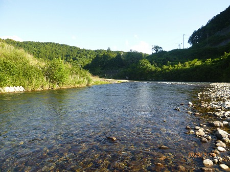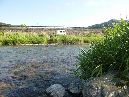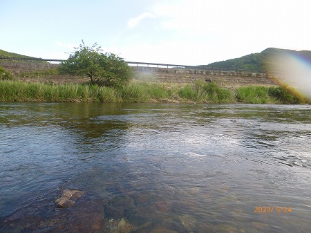 | 4時半ころ阿曽大橋へ移動。橋上流はお一人だけ。草に隠れて向こう側を引くとバーン!3連発 |