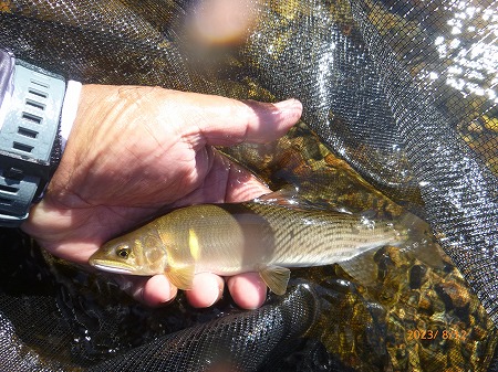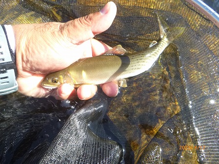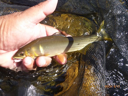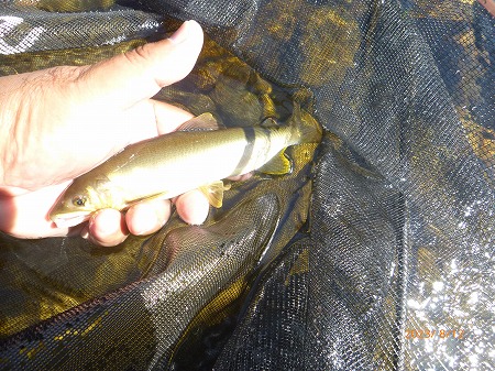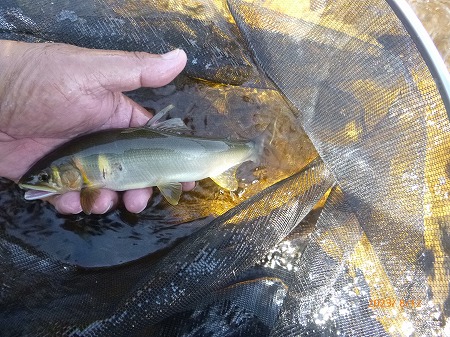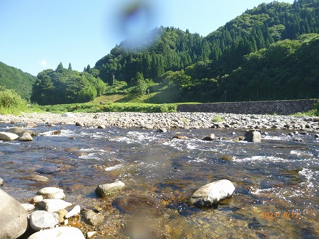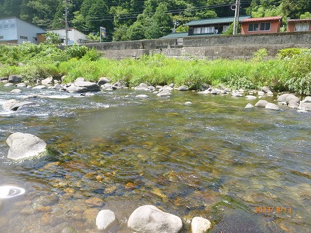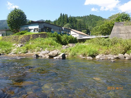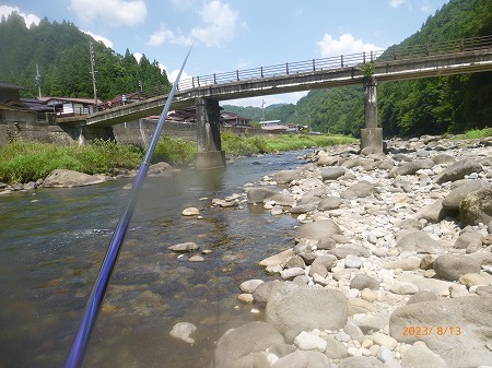 | この右半分で良型入れ掛かりだった。この上流はデカい石を人工的に並べた棚が3つくらいありました。そのデカい石の間にデカい鮎が居ました。石に糸が擦れるので、メタルラインじゃないと攻められません。 | 渇水で苦労するかと思っていたが、意外に楽しめた。 |