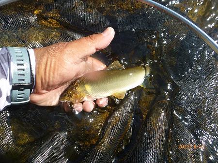 | お盆休みで郡上へ。榎本師匠が白鳥に居るとのことで向かう。鮎パーク下流に陣取っていたが、ここは既に網が入っている様子です。ド渇水でしたので、網が入っていては厳しいだろうと少し上流の専用区へ。ウロウロ見てから鮎パークの上流右岸に停めてやってみることに。初めての場所です。降り口の前は瀬の中間にある棚。8時開始。 おとりがなんだか弱いがやってみましょう。ゼロテントレースを練習したく、タイプSでやります。棚の一番当たり前ポイントから開始。石色は良いが?簡単にはいかんわなぁー。棚の下や流れ込み白泡の中を探るもダメ。根掛かりで場所も荒らしたので左岸側の浅い流れを狙うことにする。おとりが動くので居るようす。掛かるまで我慢する。やっと掛かった。16p位。おとりが替わると流れも変わる。ホントしょぼい流れで良型が掛かる!タライほどのポイントを探っていった。石が大きくなると追いが無くなる。トロっとした流れは石色も良くなくてダメだった。 初めての場所なのでどんどん登っていく。右岸から谷が入っている辺りからは2番流れのチャラも含めて石色が良くなった。深いところ、浅いところ、白泡、砂利、色々探っていくとなんとなく傾向が見えてきたぞ。やりにくいところはデカい!流れが走ったところが良い!昼まで14匹。 午後はこの辺りを中心に更に上流を探るべく車を移動させます。木陰でランチ。昼前にドカン!とえらい音がしましたが、北濃の駅前で事故していました。お盆の楽しいお出かけが残念な出来事に。気を付けねば。 さて午後開始。ポロポロ拾って2時半頃。喫茶かじかの下辺りのちょっとした瀬で白泡を探るとドカン!ドカンと連発。デカいのばかり。タライほどのツボ全部に居る感じ。この辺りは川を重機で触ったらしく、右岸の護岸沿いは人工的にでっかい石が並んでいます。デカい石でも動くので危ない。その間にデカい鮎が付いています。石に水中糸が擦れまくるのでメタルが必要。根掛かりも多いので渇水じゃないと攻められない流れでした。午後はほぼ20pオーバーばかりで18匹。苦手な渇水でしたが、自分的には上手く釣ることが出来て満足な釣行でした。夜は榎本師匠の所へ戻って和人君やO原さんも合流して宴会でした。 さて、翌日13日は夕方までに鮎を持ち帰りたかったので2時頃までの予定です。皆で昨日のポイントへ。昨日午後に釣った鮎が船に入れすぎで弱っていましたが、伏流水の冷たい流れに付けて置いたら元気に回復。前日学習できているので攻め方を組み立てる。7時開始。入れて3秒で掛かる!でっかいぞ!口掛かりで抜いたらよそへ飛んでった!でもこれなら余裕で掛かるだろう。沈黙。30分おとり変わらず。昨日やっていない流れを打っていくとボツボツ掛かった。当たり前の流れでも丁寧に探ると掛かった。小さい竿抜けポイントを打って掛ける、散々竿が入っているだろう流れを少し時間をかけて丁寧に掛ける、両方できた。2時までやって22匹。渇水、釣り荒れポイントの釣り方が少し勉強出来た感じで良かったな。帰って郡上のデカ鮎を炭火でじっくり焼いて食す。美味いな〜。 |